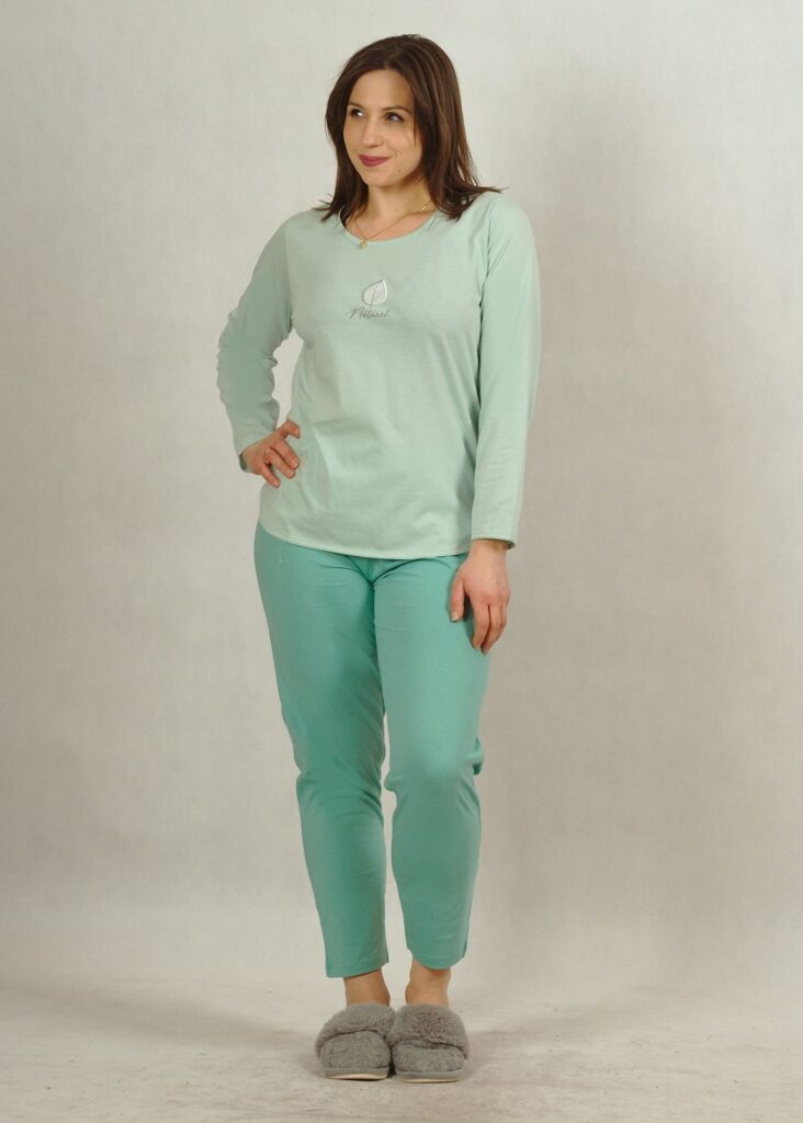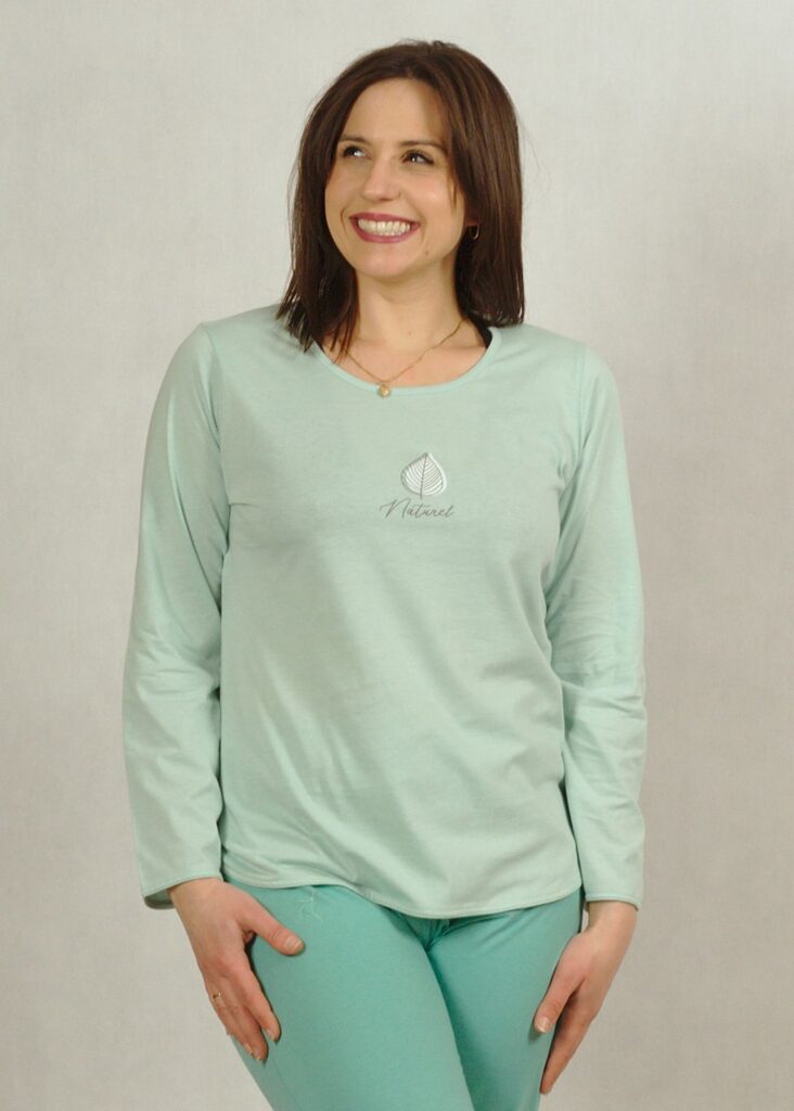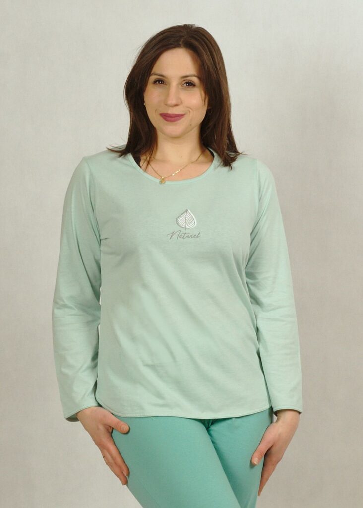 Śliczna bawełniana piżama, składająca się z zielonej bluzy z nadrukiem oraz spodni w odcieniu ciemniejszym niż góra.