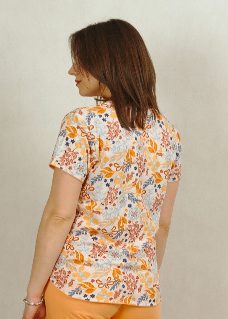 Góra od piżamy ma krótki rękaw, dokładnie obszyty lamówką.