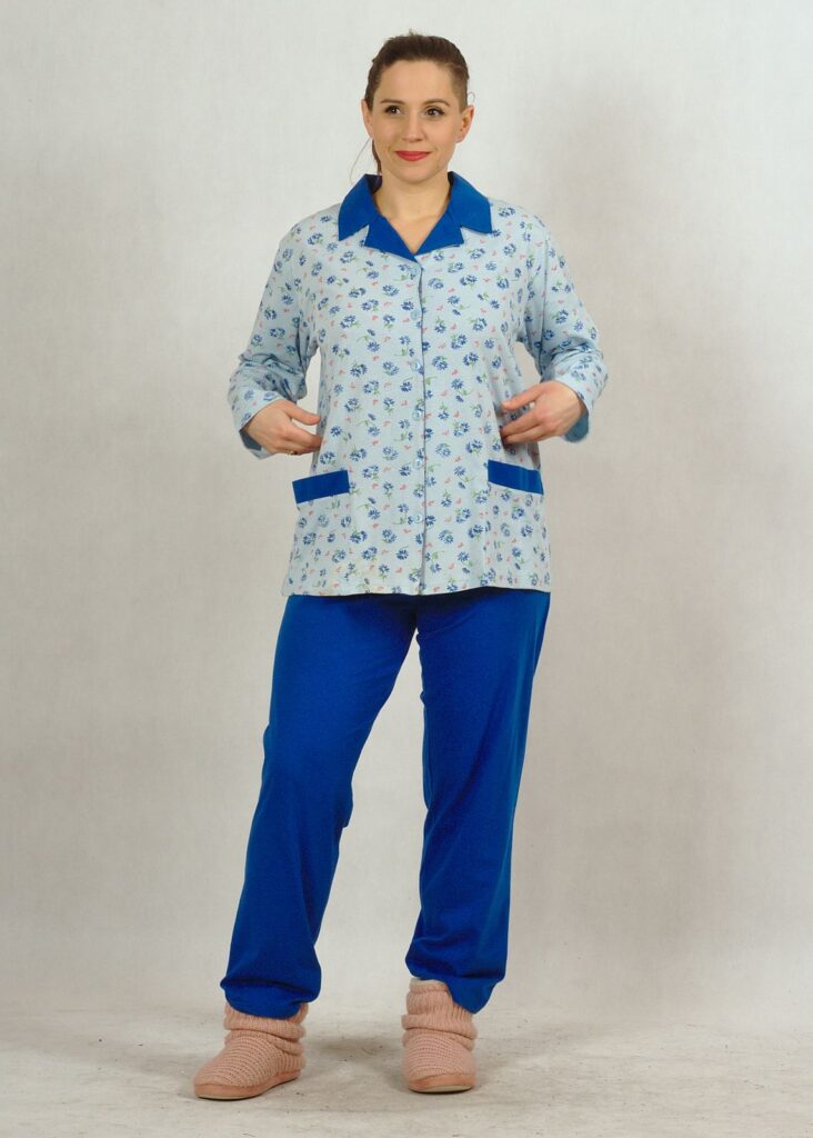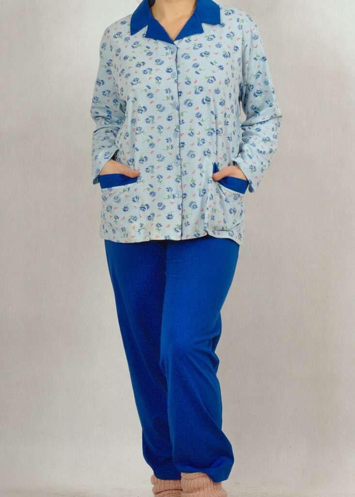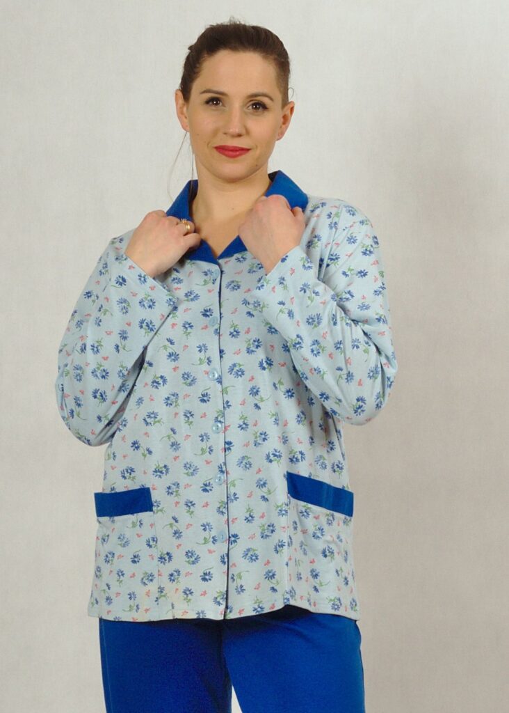 Góra piżamy to rozpinana bluza z długim rękawem, odszyta z bawełny w kwiatki. Posiada chabrowy kołnierzyk i chabrowe patki przy kieszeniach.