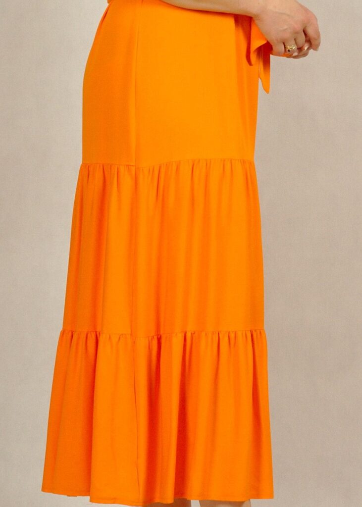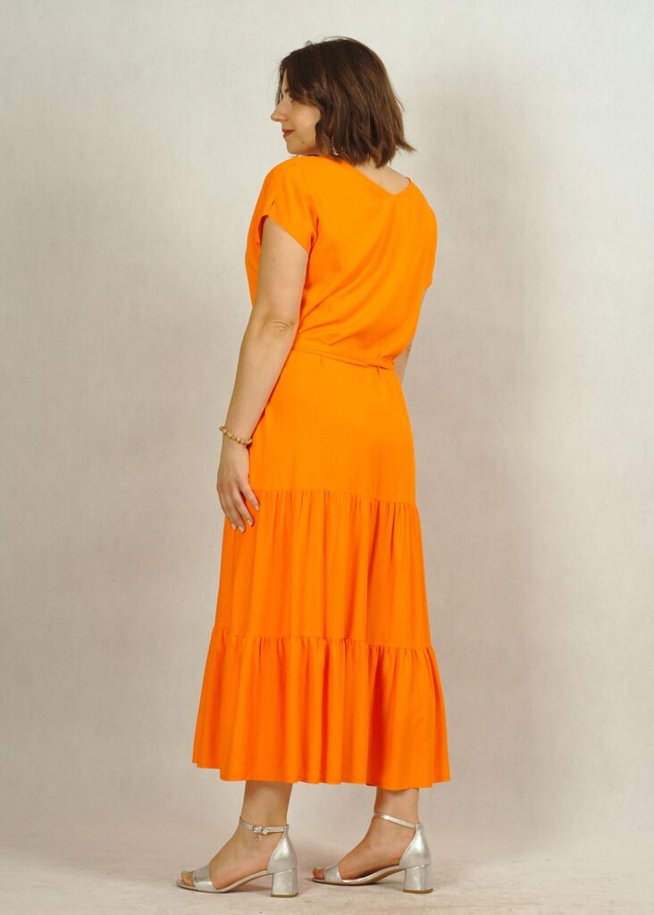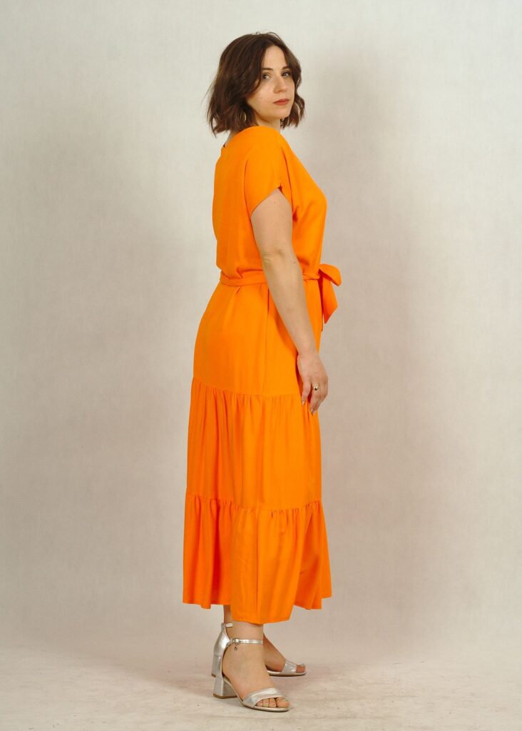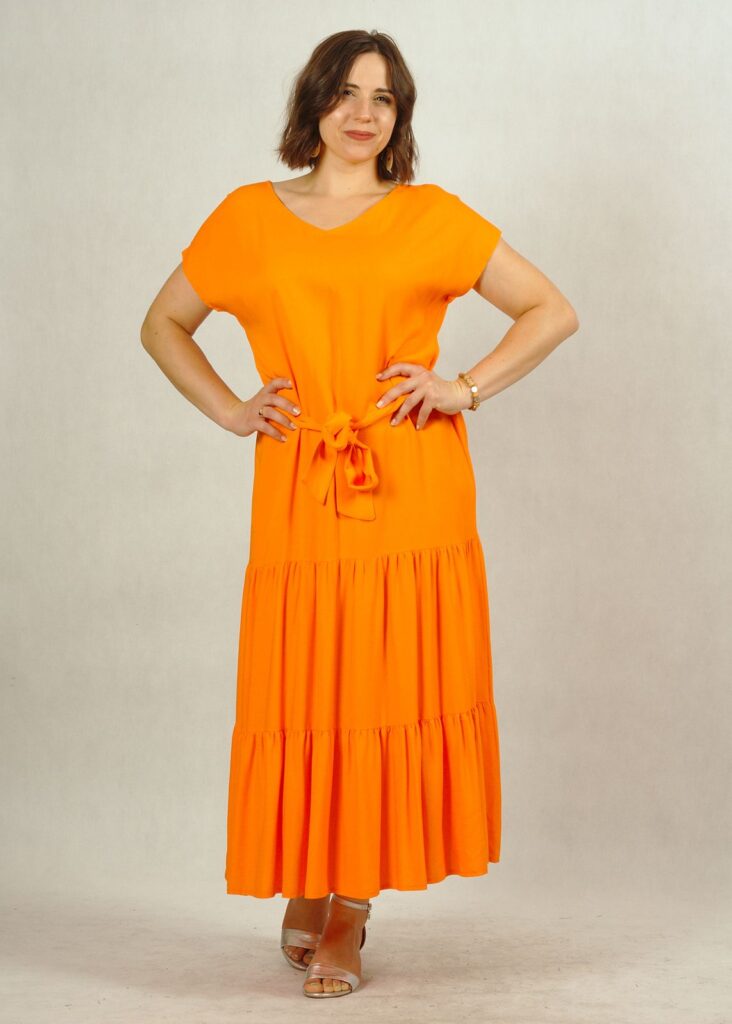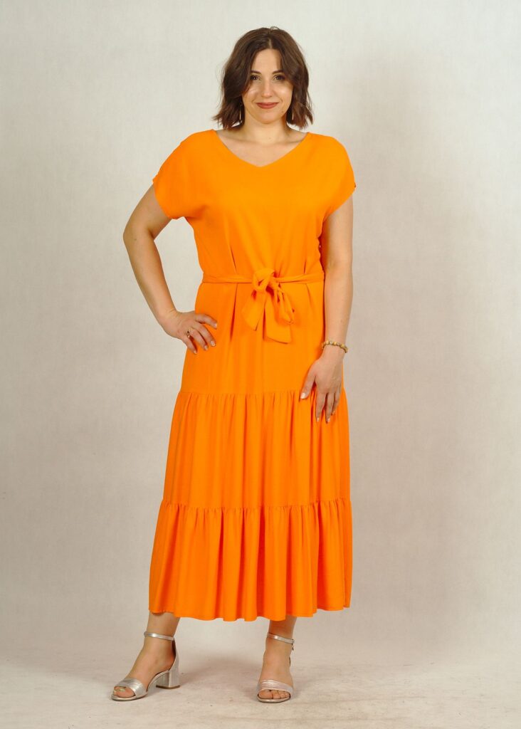 Jednokolorowa, długa pomarańczowa* sukienka z falbankami na dole, wykonana z najwyższej jakości wiskozy (100%!). Jest niezwykle przewiewna, świetni sprawdzi się w ciepłe dni. Nie krępuje też ruchów.
