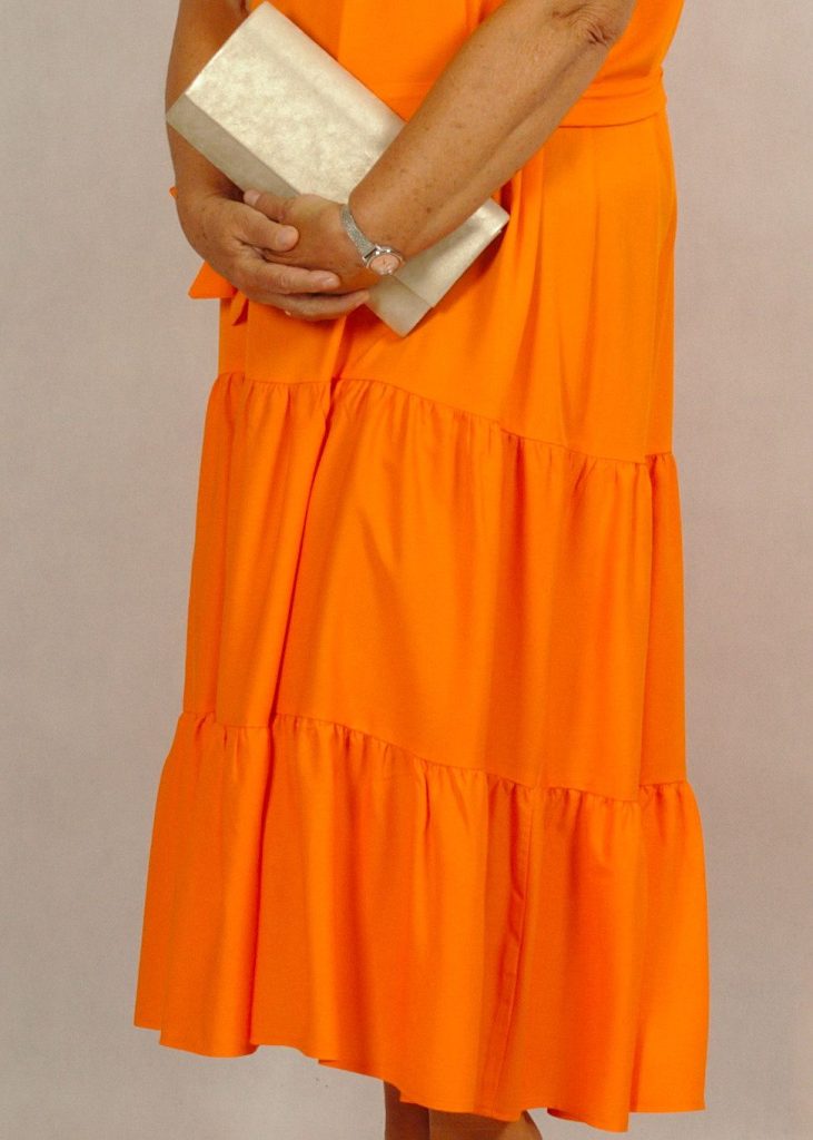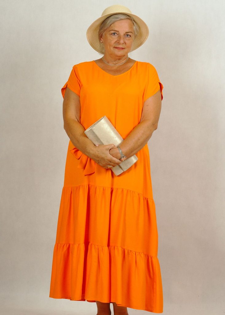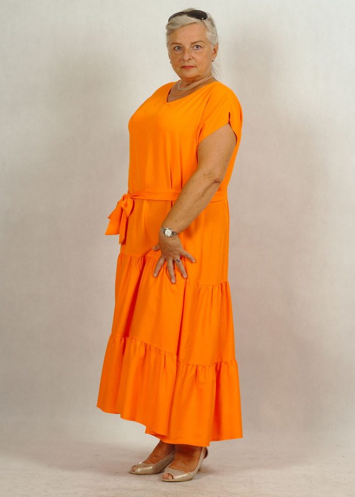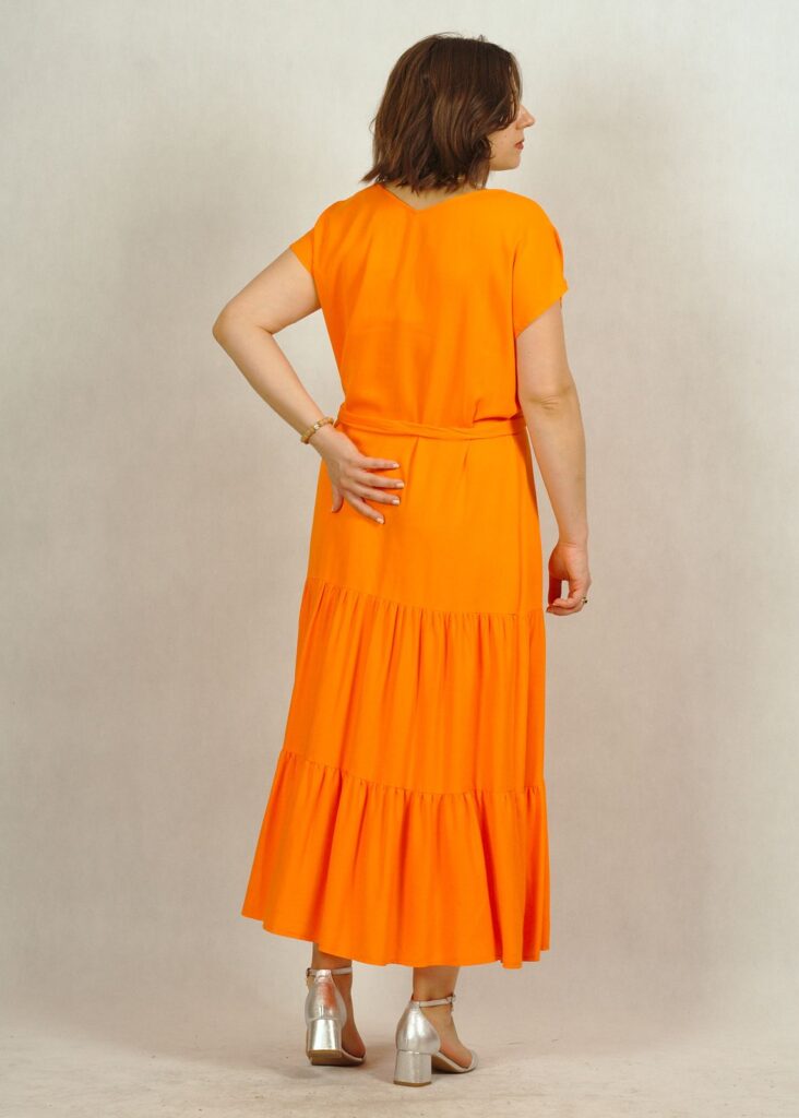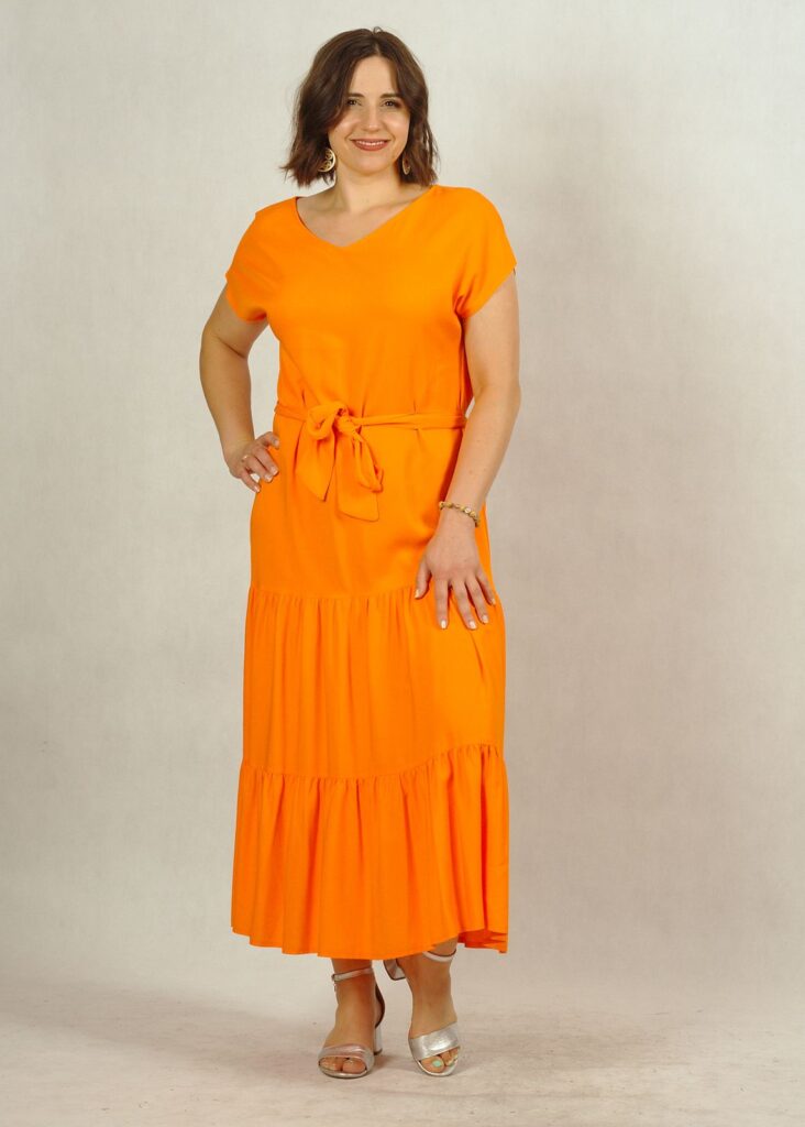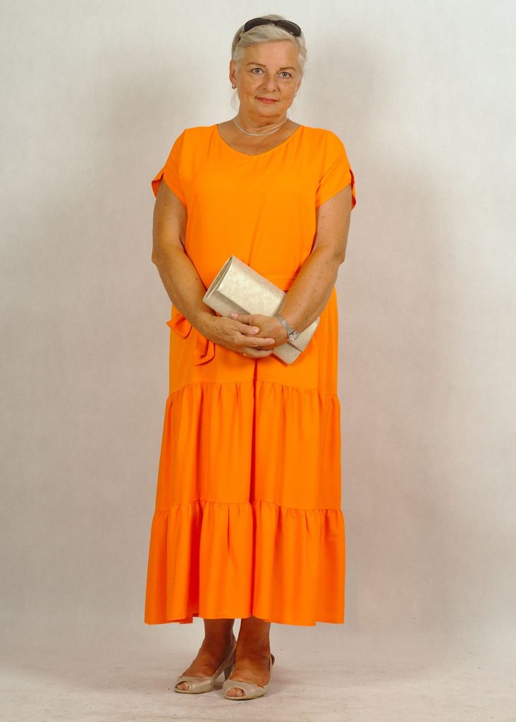 Jednokolorowa, długa pomarańczowa* sukienka z falbankami na dole, wykonana z najwyższej jakości wiskozy (100%!). Jest niezwykle przewiewna, świetni sprawdzi się w ciepłe dni. Nie krępuje też ruchów.