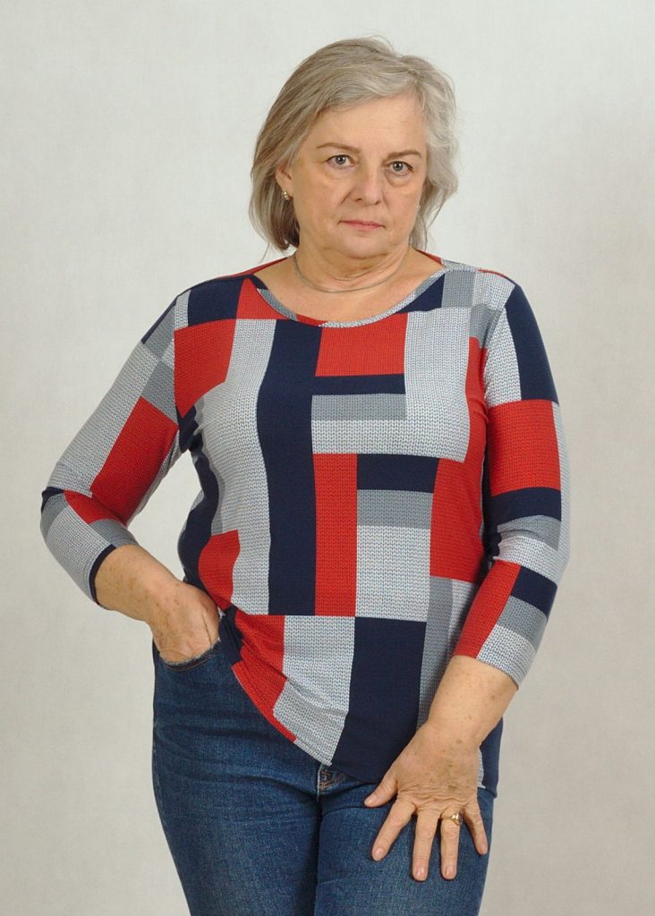 Kolorystyka bluzki jest bardzo ciekawa – łączenie granatu z czerwienią i szarością jest bardzo oryginalne i nieoczywiste*