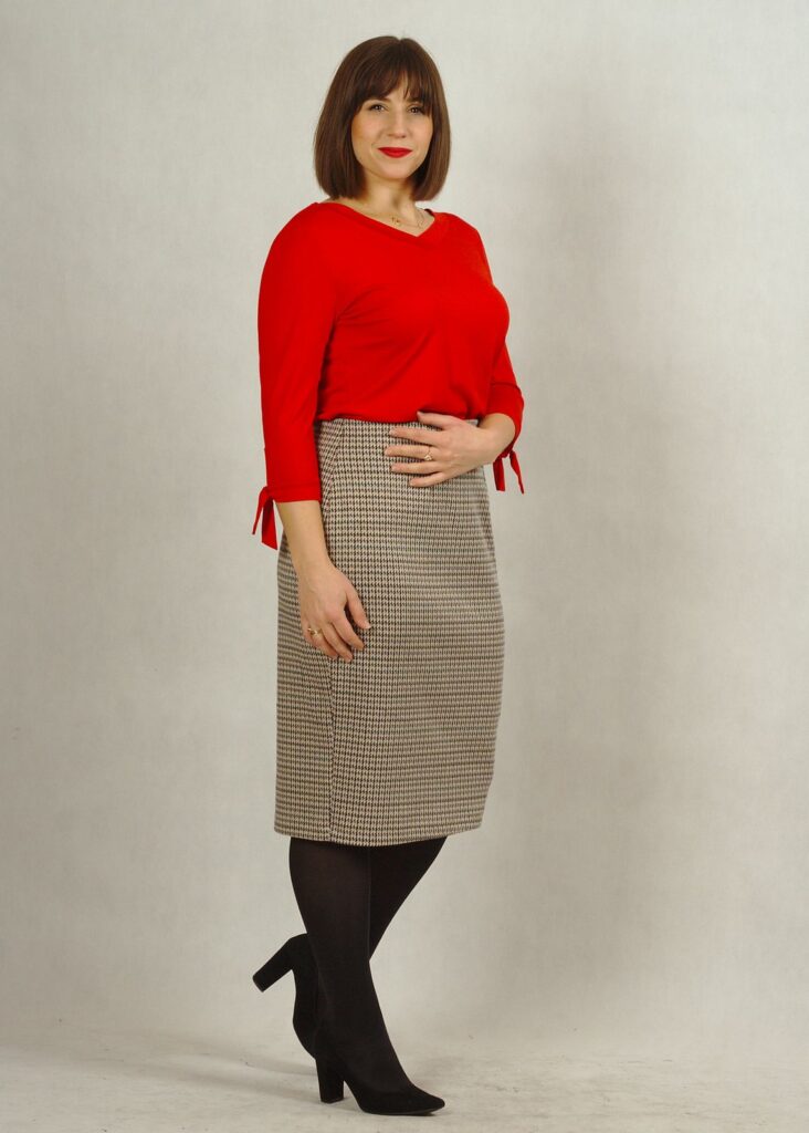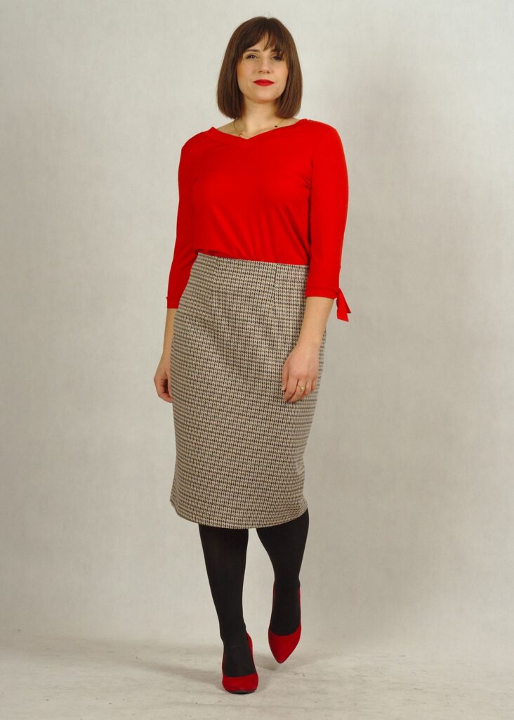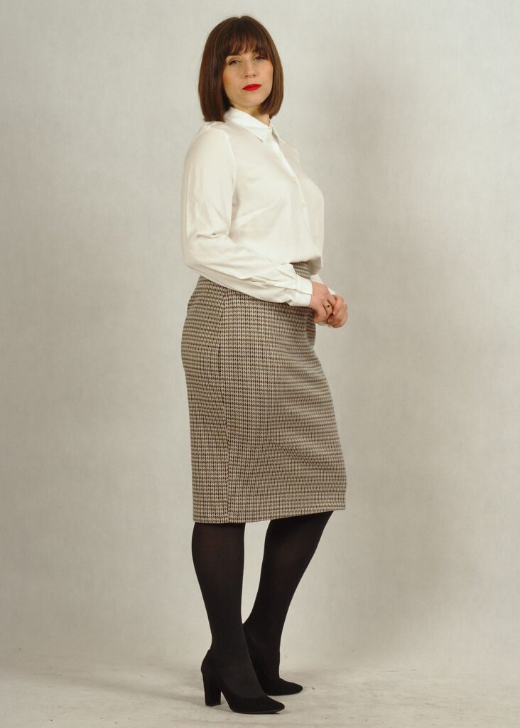 Prosta spódnica o idealnej długości do kolan to elegancka propozycja do koszuli lub bluzki.