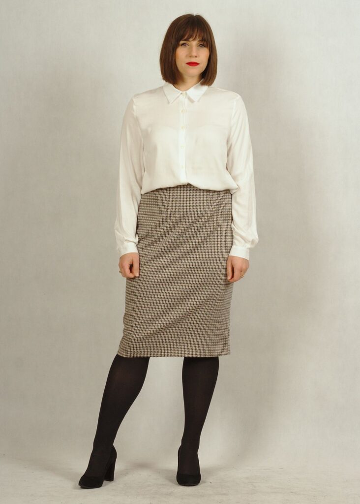 Spódnica beżowa w pepitkę świetnie komponuje się z białymi, czarnymi i innymi jednokolorowymi bluzkami.