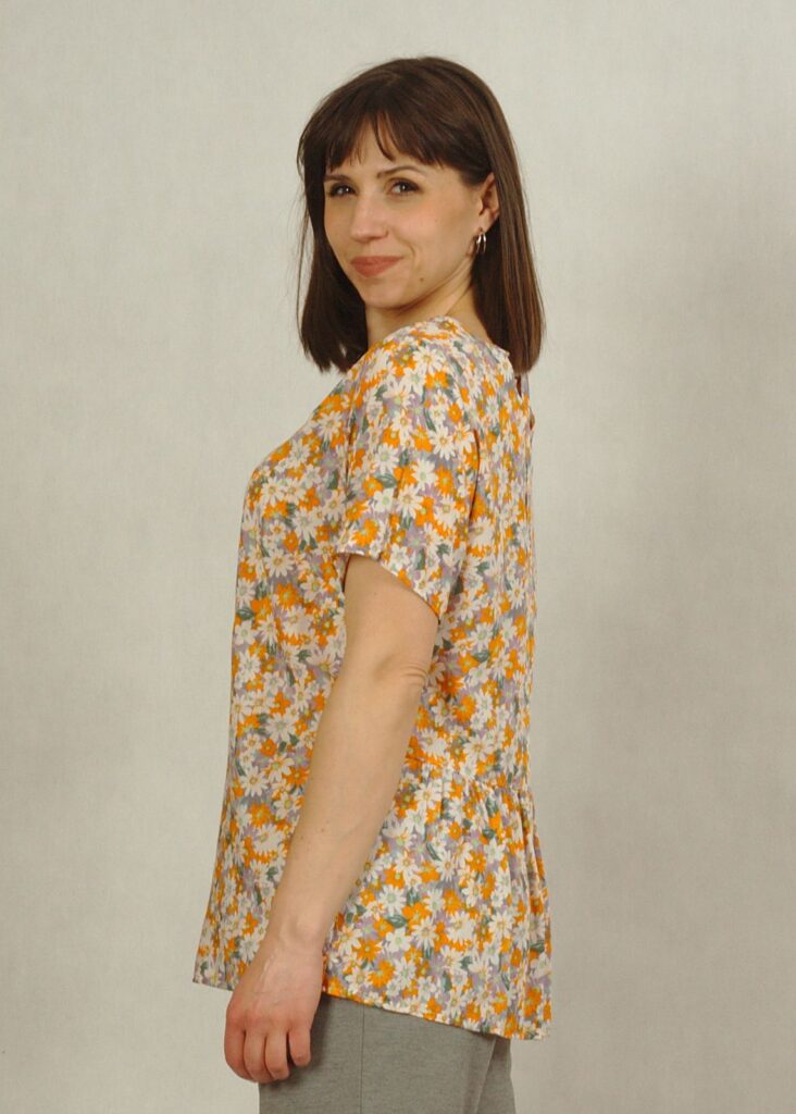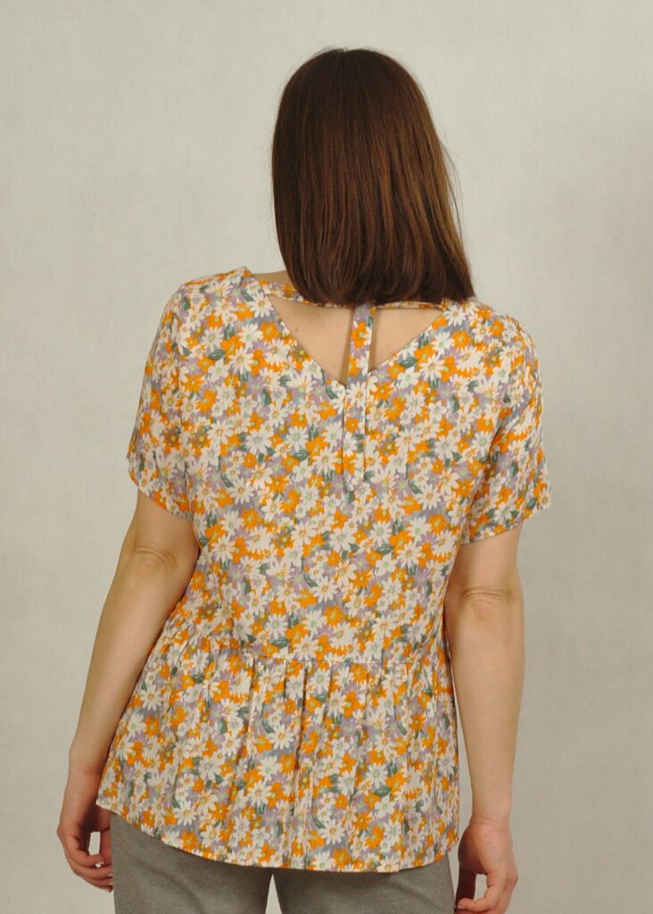 Bluzka zakończona jest falbanką z tyłu na dole, co daję uroku i kryje mankamenty sylwetki.