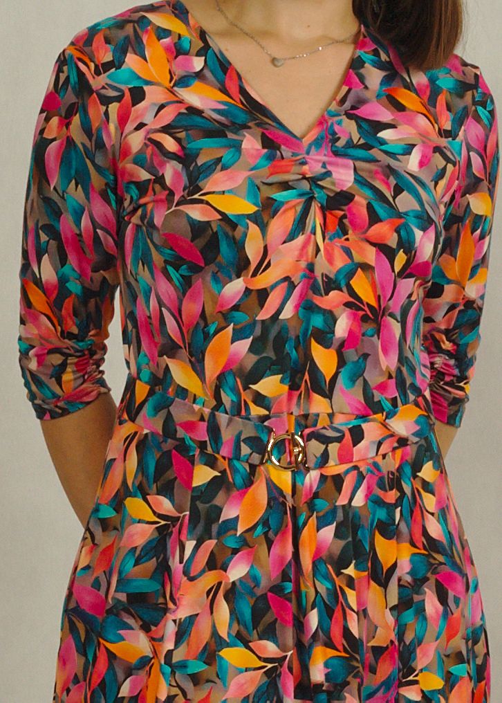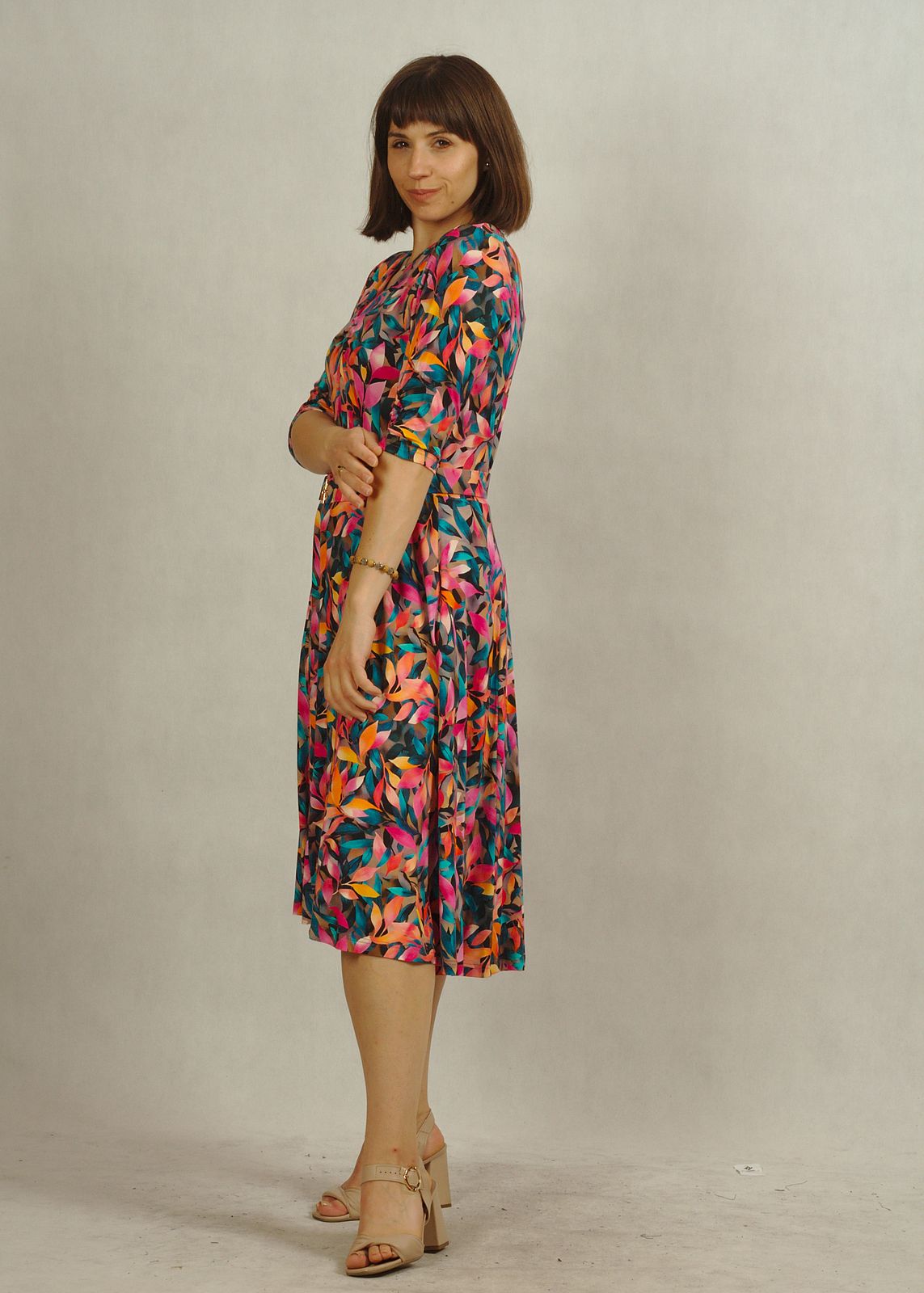 Różowa sukienka w listki z dekoltem w serek i paskiem /850/