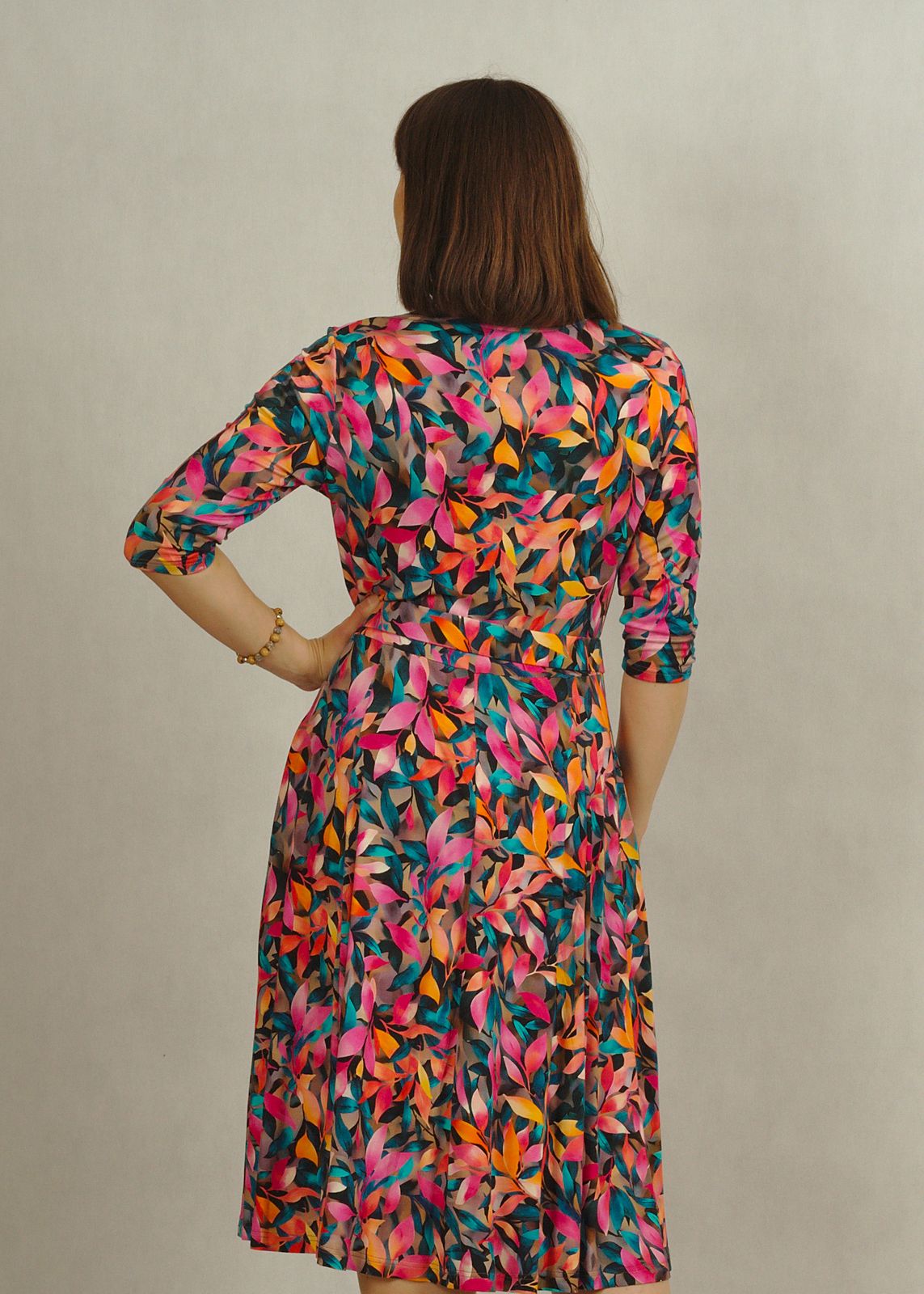 Sukienka z dekoltem w serek subtelnie podkreśla szyję, a rękaw 3/4 sprawia, że sprawdzi się przez cały rok.