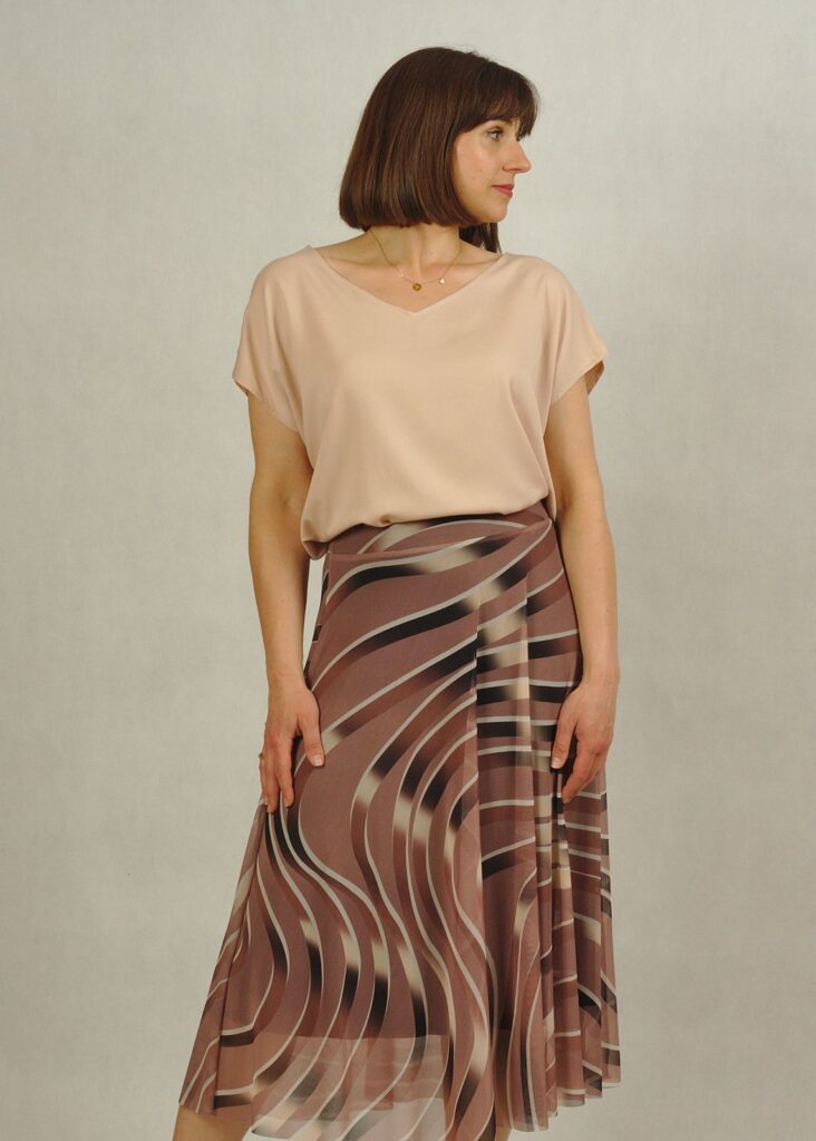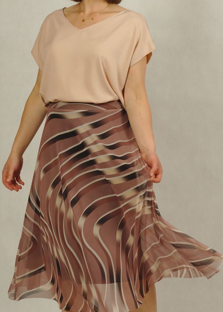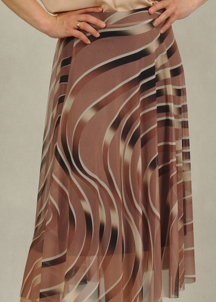 To spódnica w delikatne brązowe wzory na beżowym* tle.