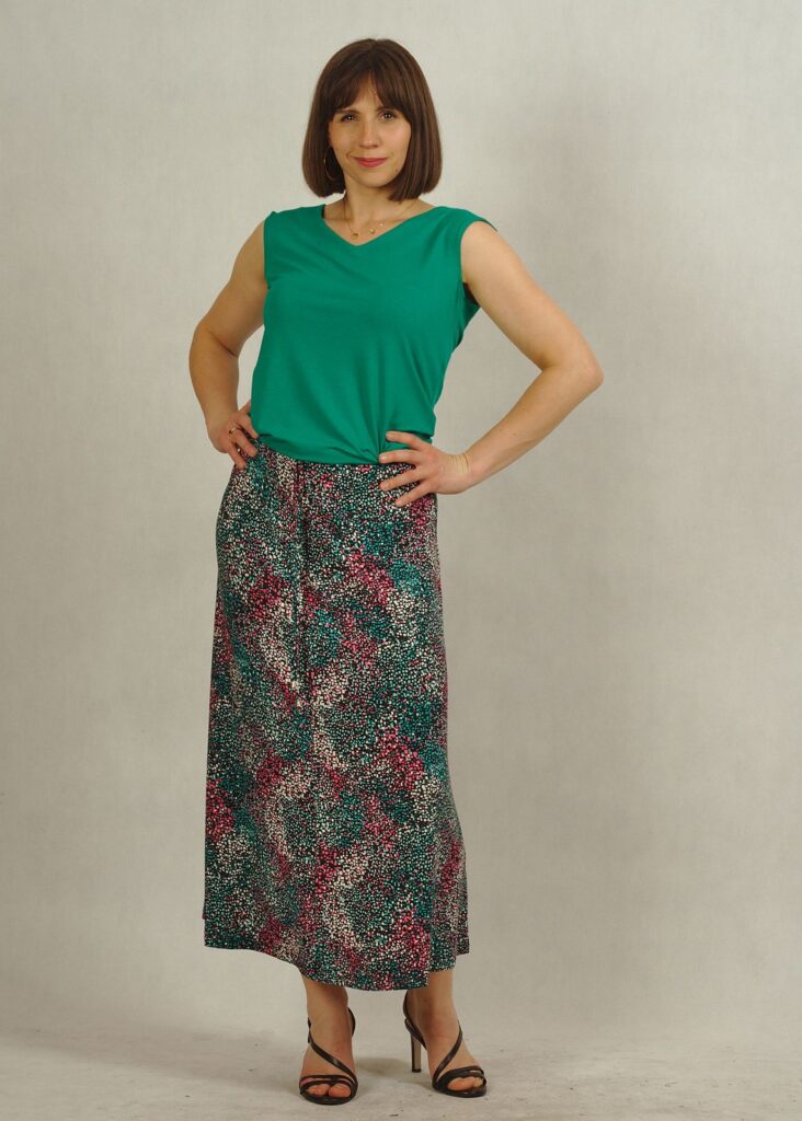 Długość midi to uniwersalny wybór — idealny zarówno do pracy, na spacer, jak i na letnie wyjścia.