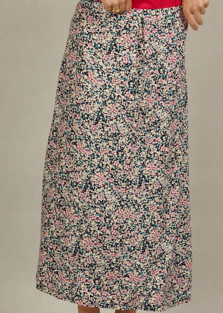 Miłośniczki romantycznych wzorów zakochają się w naszej spódnicy w kwiatki, ozdobionej subtelnym motywem wielokolorowych kwiatków.
