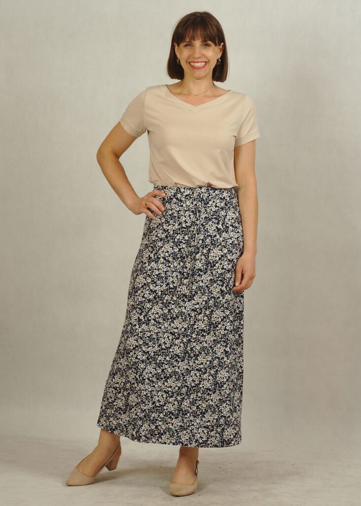 Jasna, wielokolorowa spódnica w kwiatki to świetna opcja na ciepłe dni – jej lekka tkanina doskonale sprawdzi się wiosną i latem.