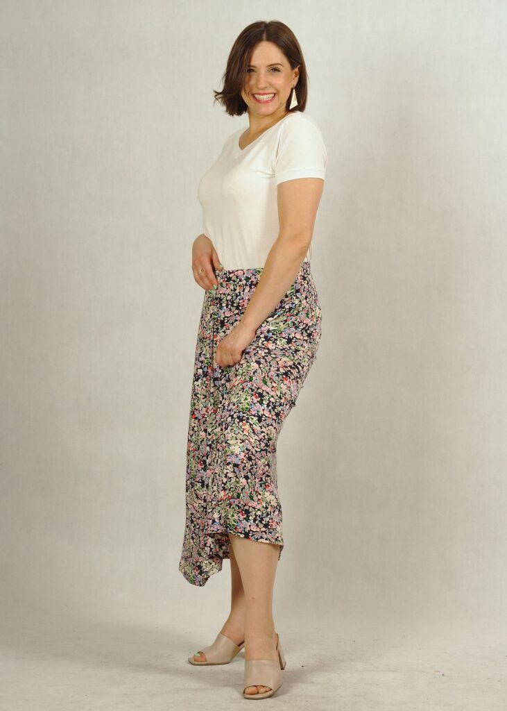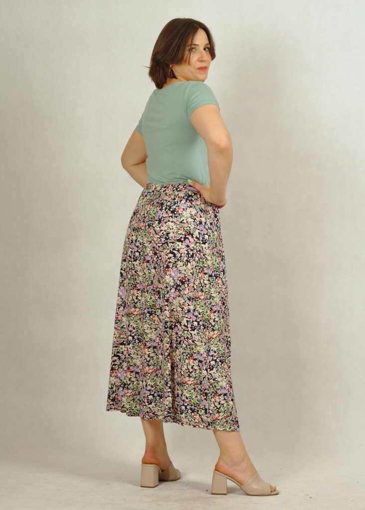 Spódnica na gumce w pasie, co również daje duże poczucie wygody – nie trzeba jej zapinać. Posiada jedynie subtelne troczki w pasie, uszyte z tego samego materiału.
