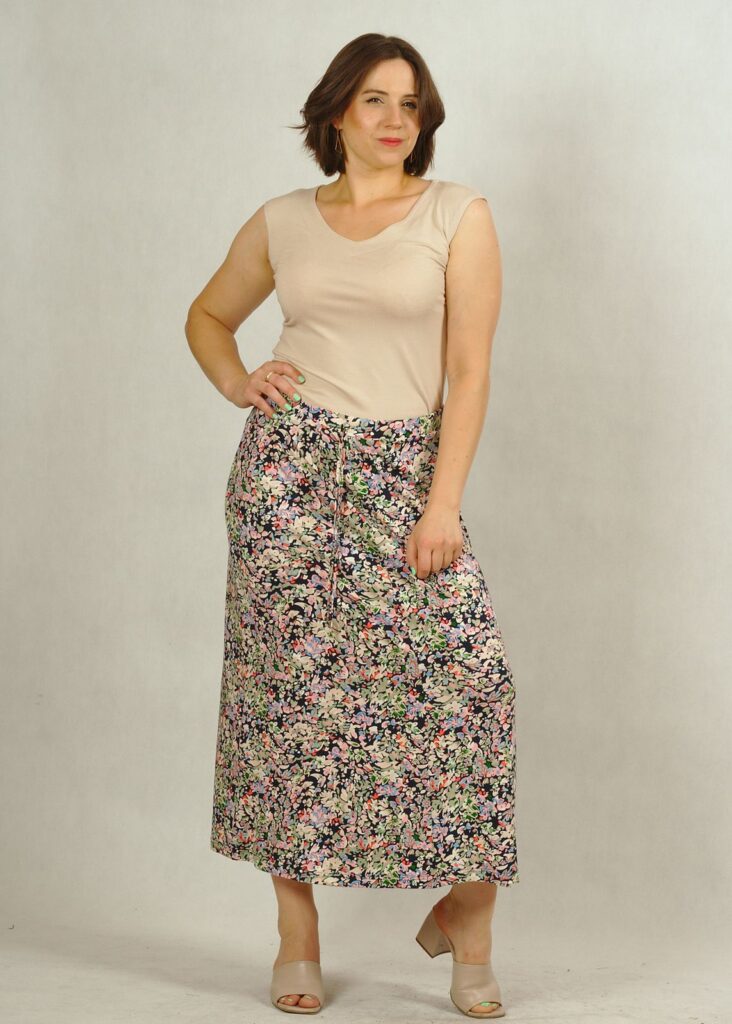 Każda nasza spódnica w kwiatki idealnie pasuje do jednokolorowych topów i bluzek, jak na przykład w stylizacji na zdjęciach:https://damana.pl/produkt/top-na-szerokich-ramiaczkach-w-kolorze-jasnego-fioletu-plus-size/