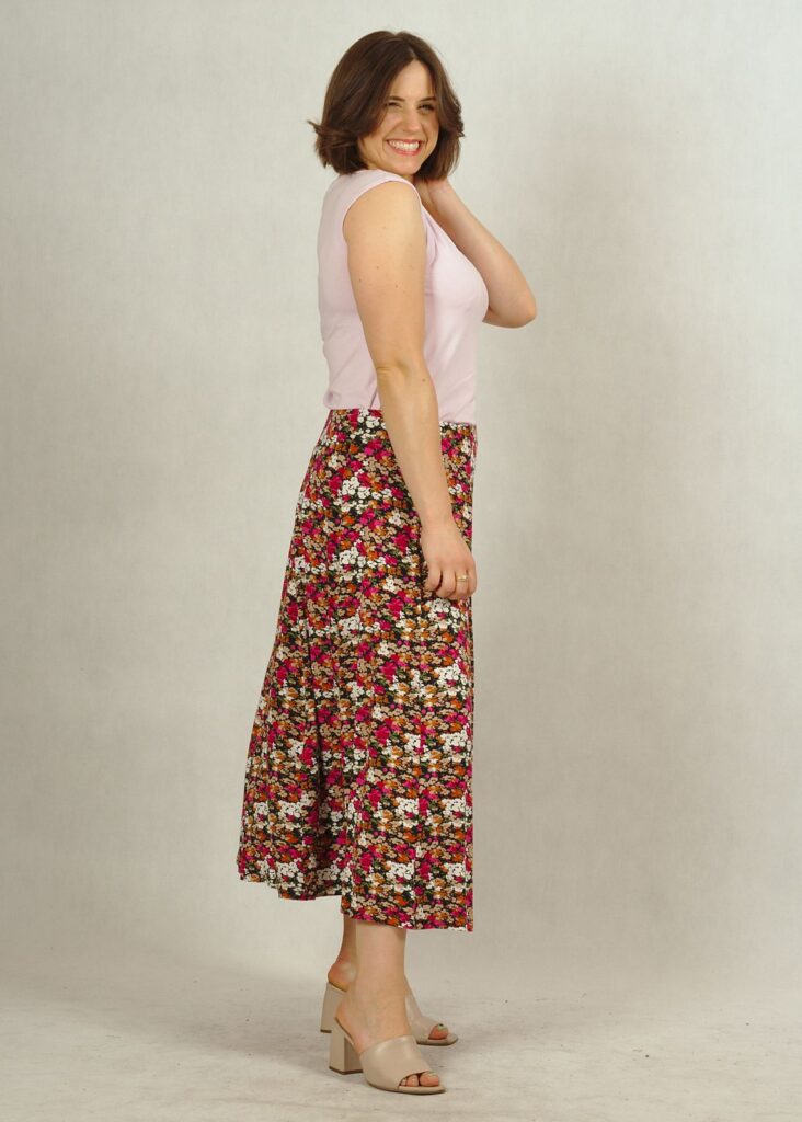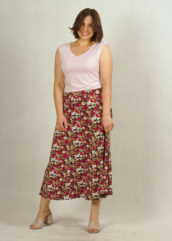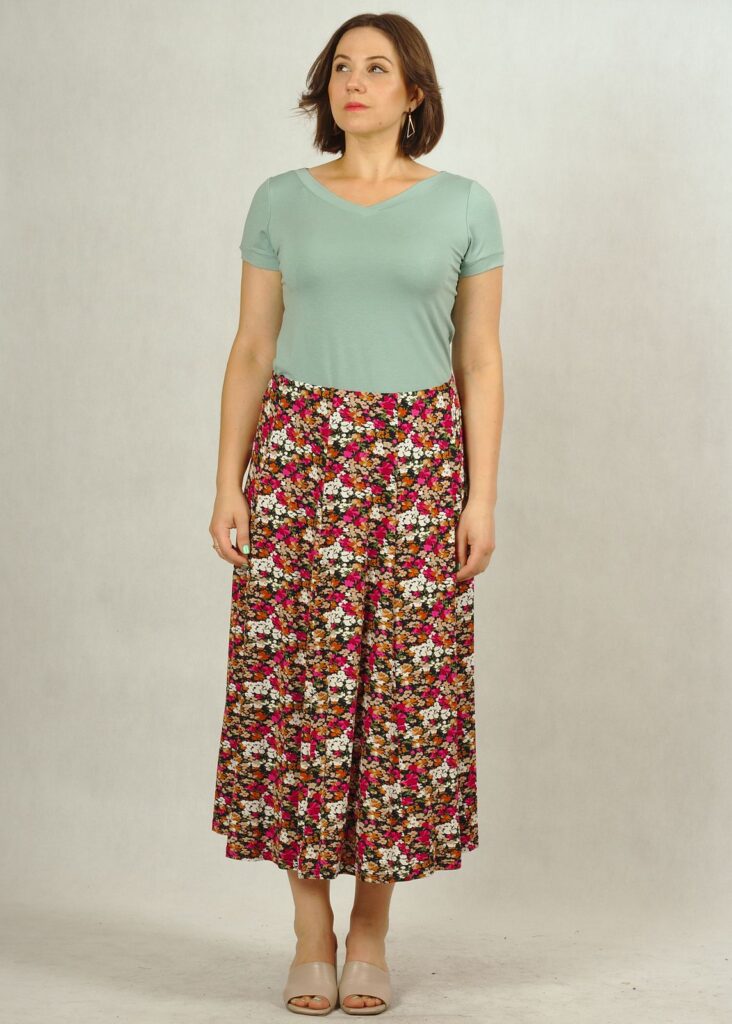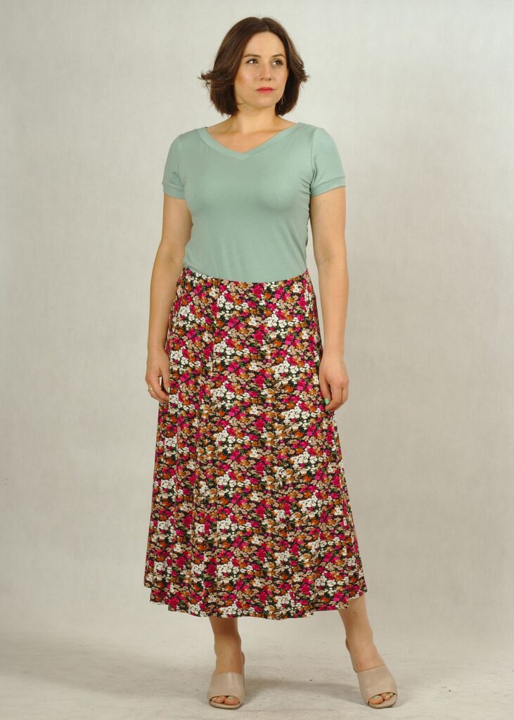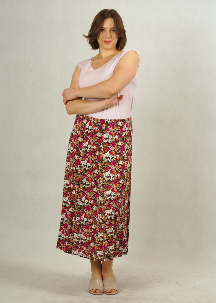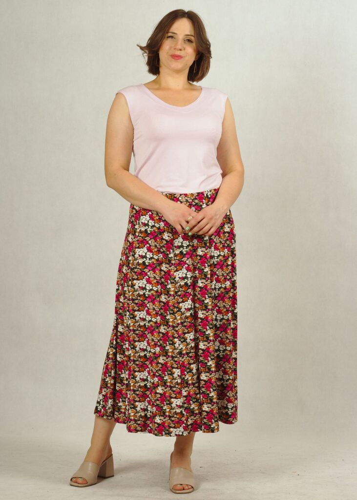 Każda nasza spódnica w kwiatki idealnie pasuje do jednokolorowych topów i bluzek, jak na przykład w stylizacji na zdjęciach:https://damana.pl/produkt/top-na-szerokich-ramiaczkach-w-kolorze-jasnego-fioletu-plus-size/