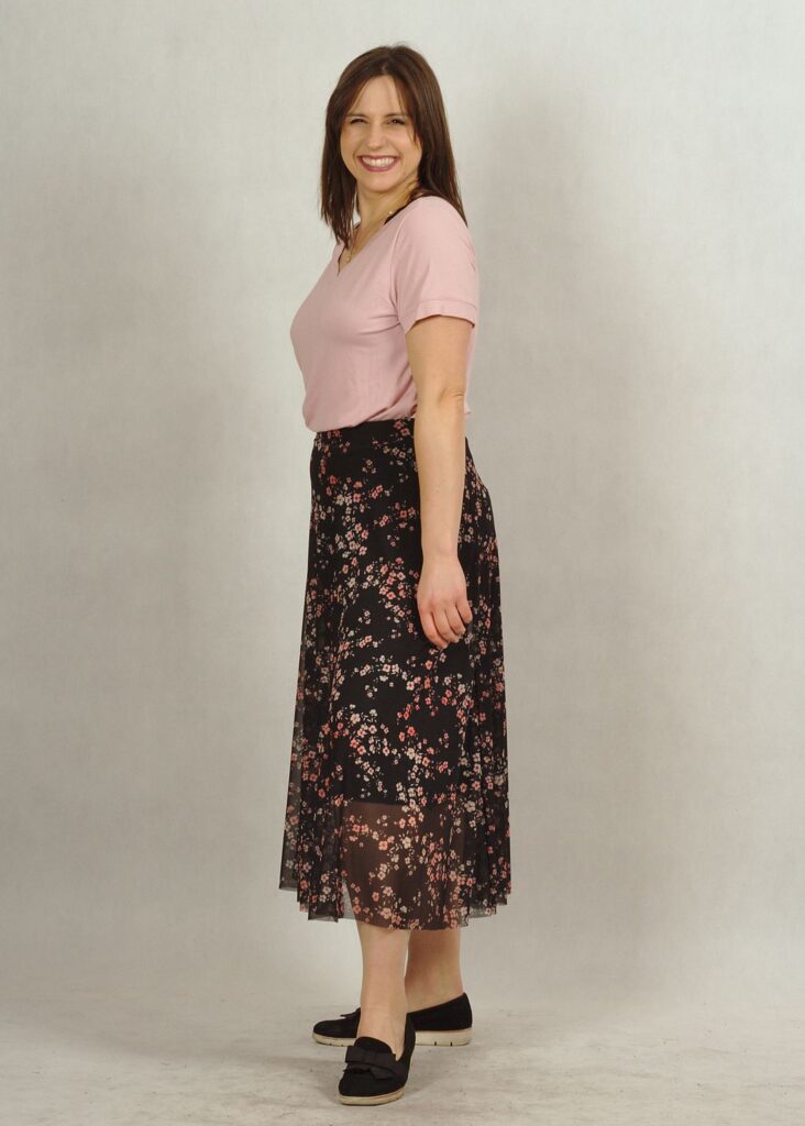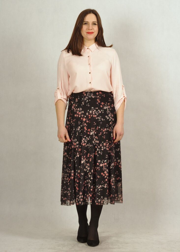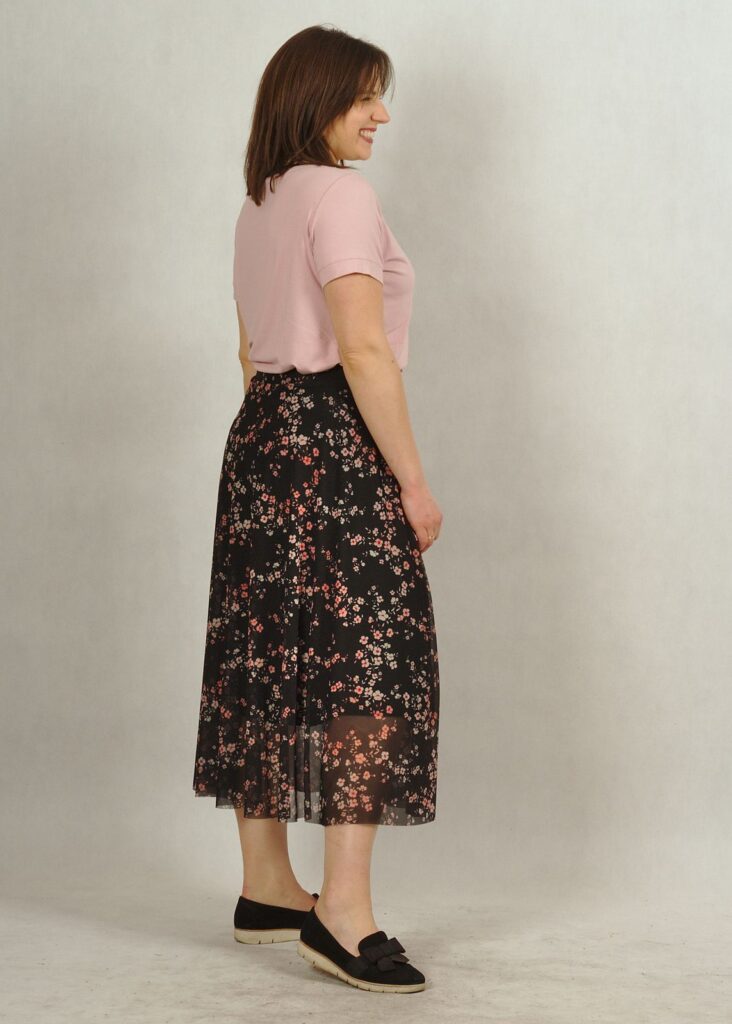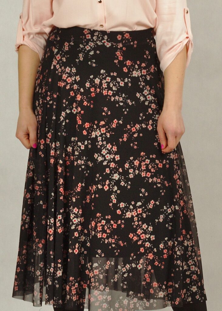Długa spódnica składająca się z dwóch części – z wiskozowej podszewki z dzianiny oraz z poliestrowej siatki drukowanej.