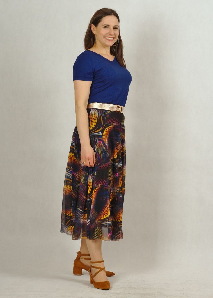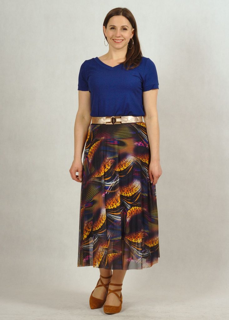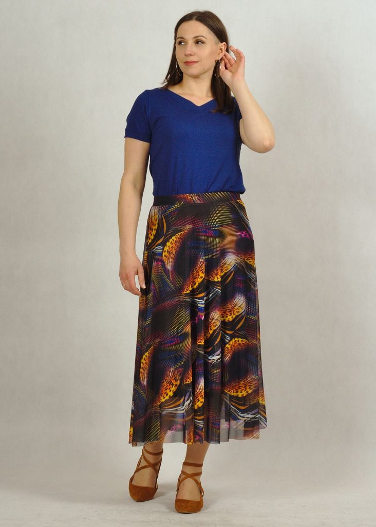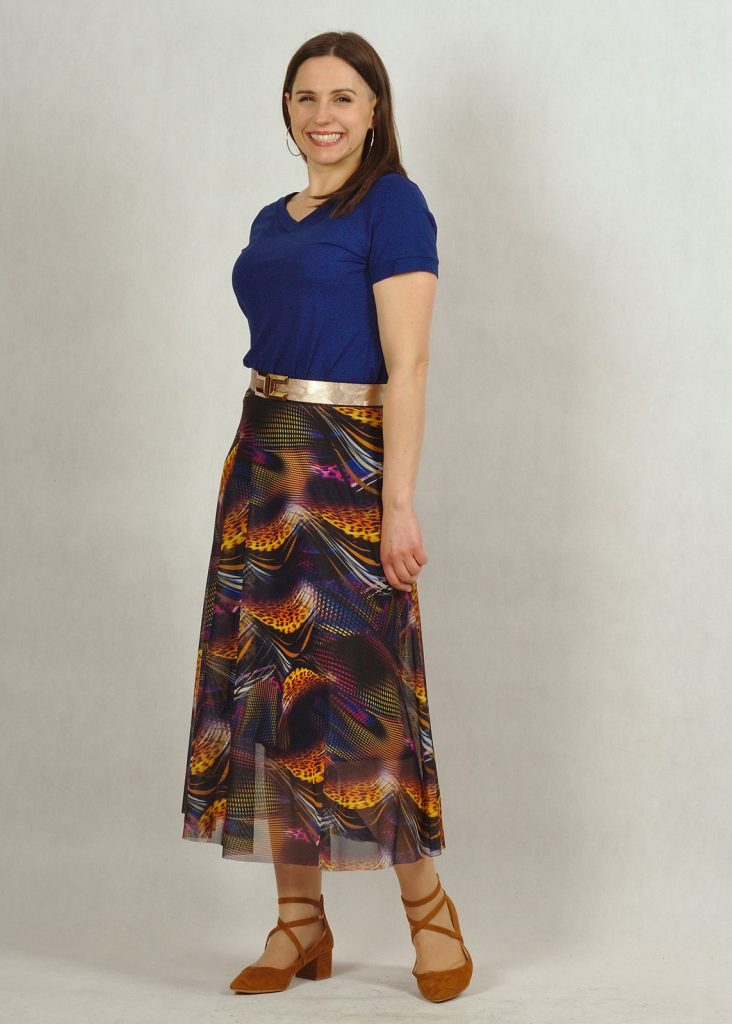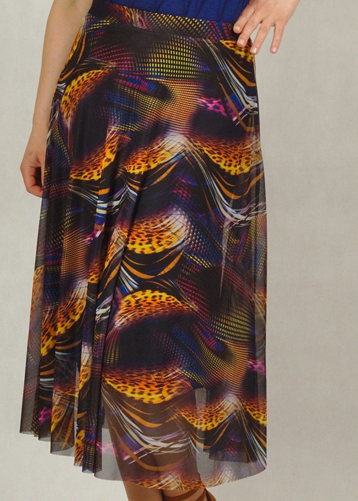 Długa spódnica składająca się z dwóch części – z wiskozowej podszewki z dzianiny oraz z poliestrowej siatki drukowanej.