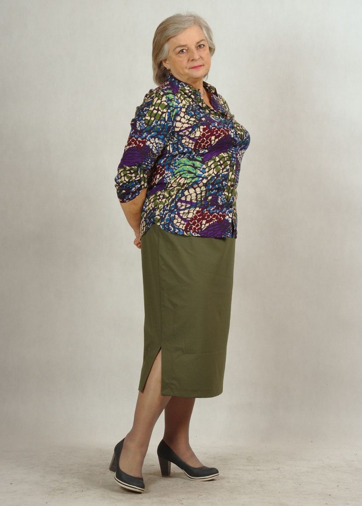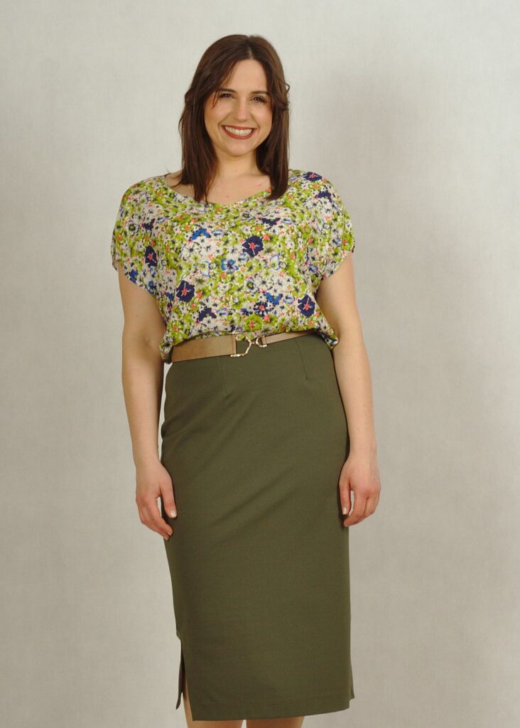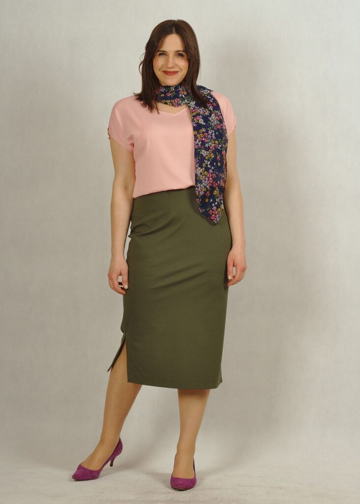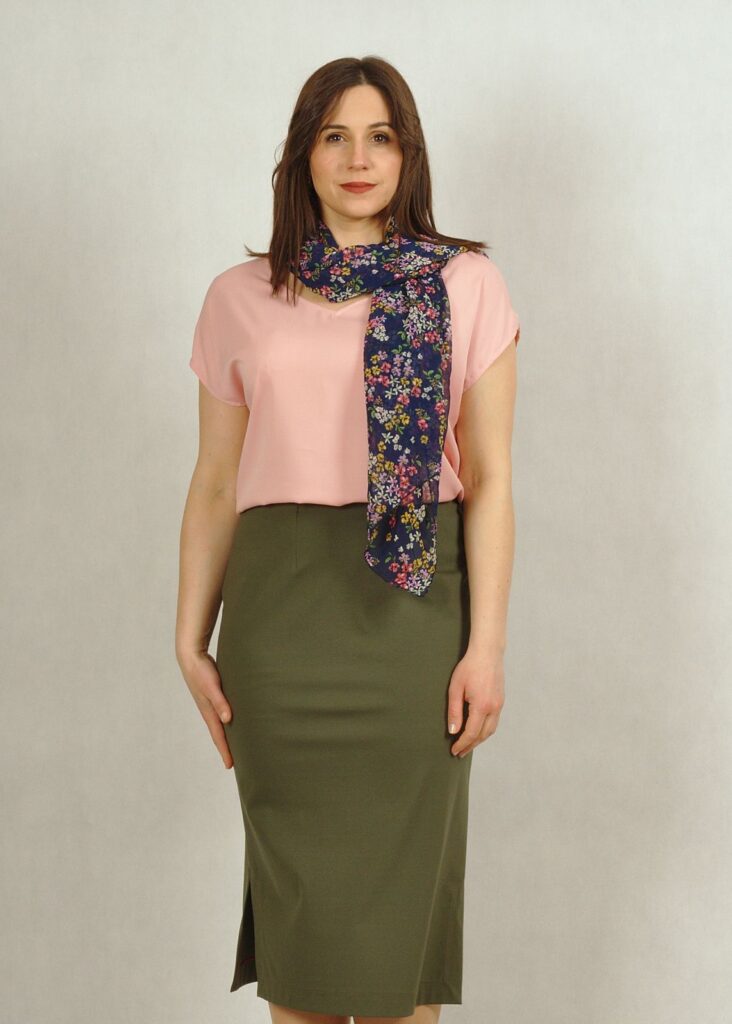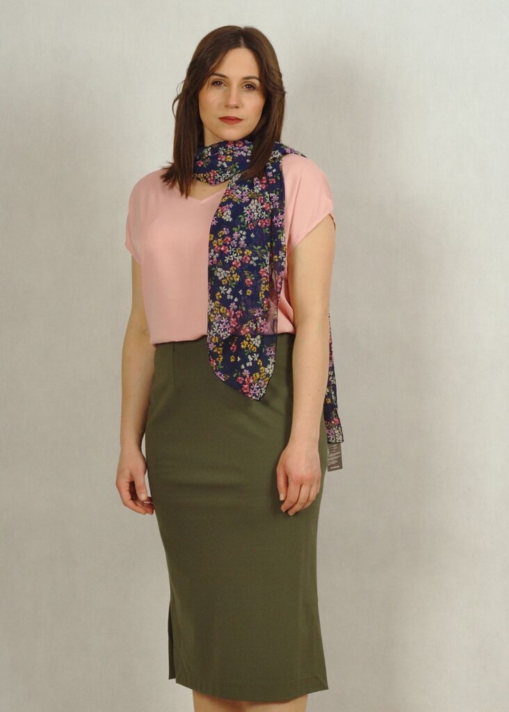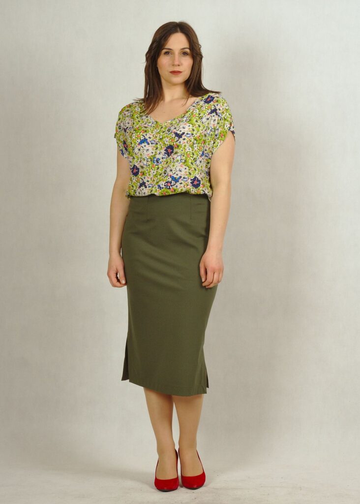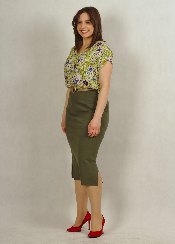Długość całkowita spódnicy sięga do połowy łydki – pozwoli zatuszować wszystkie mankamenty dolnych partii ciała 🙂