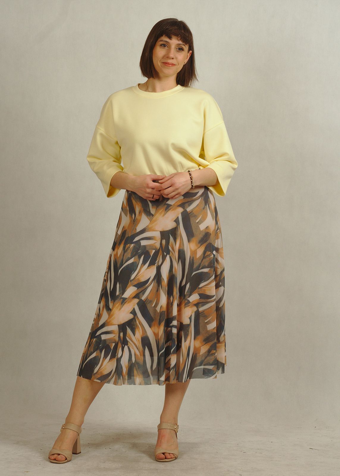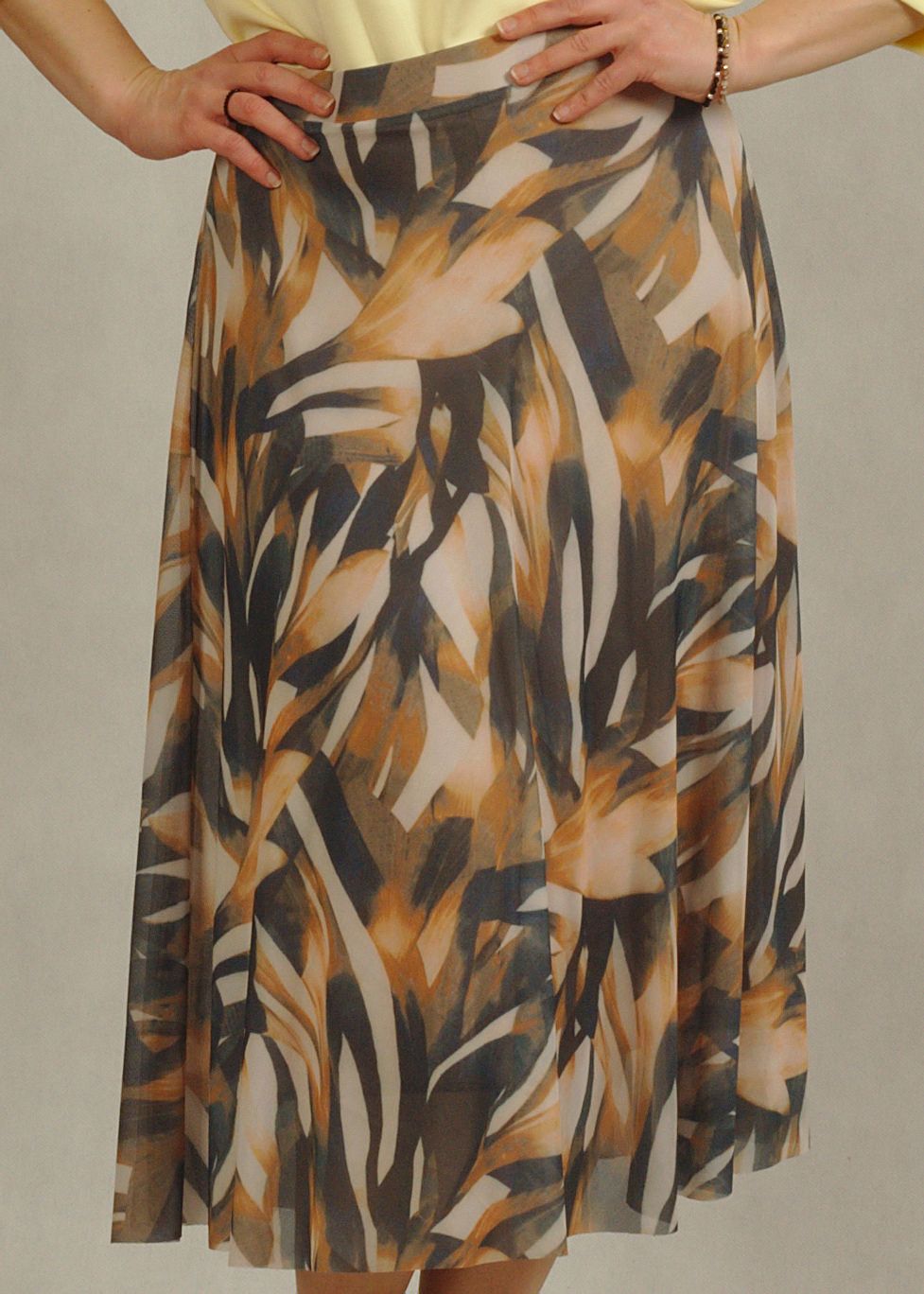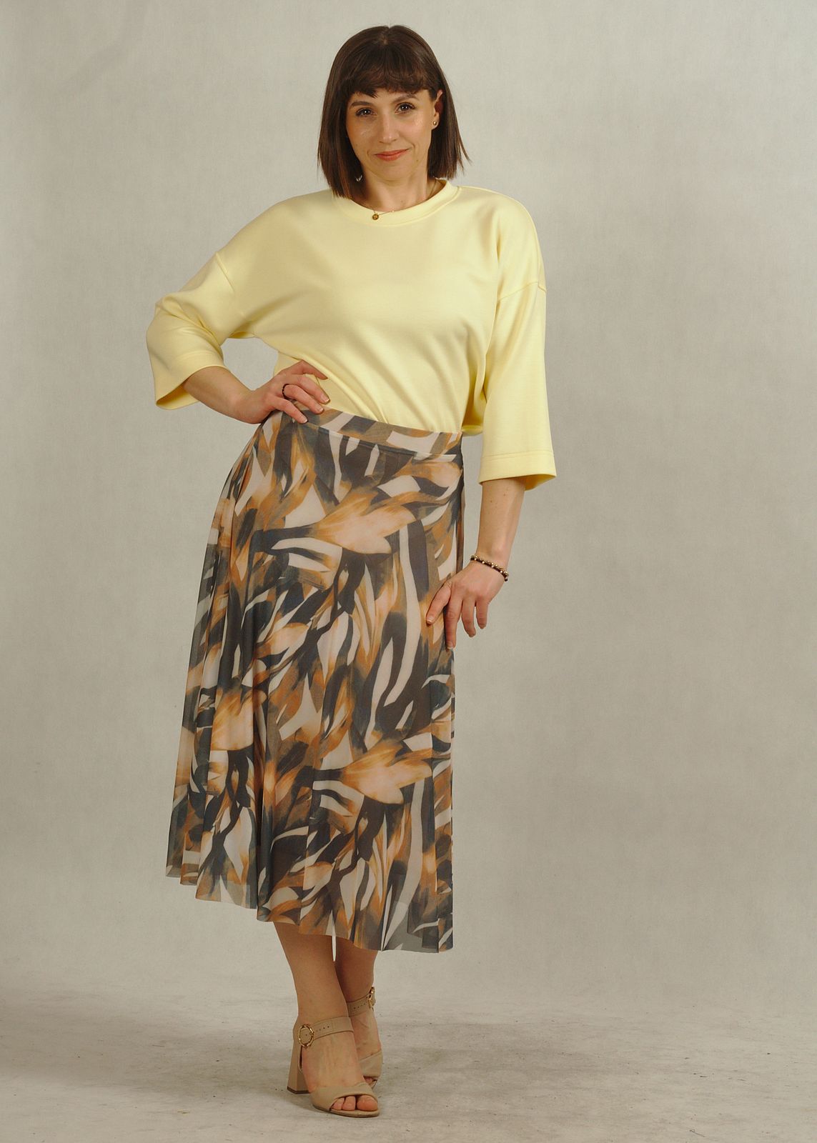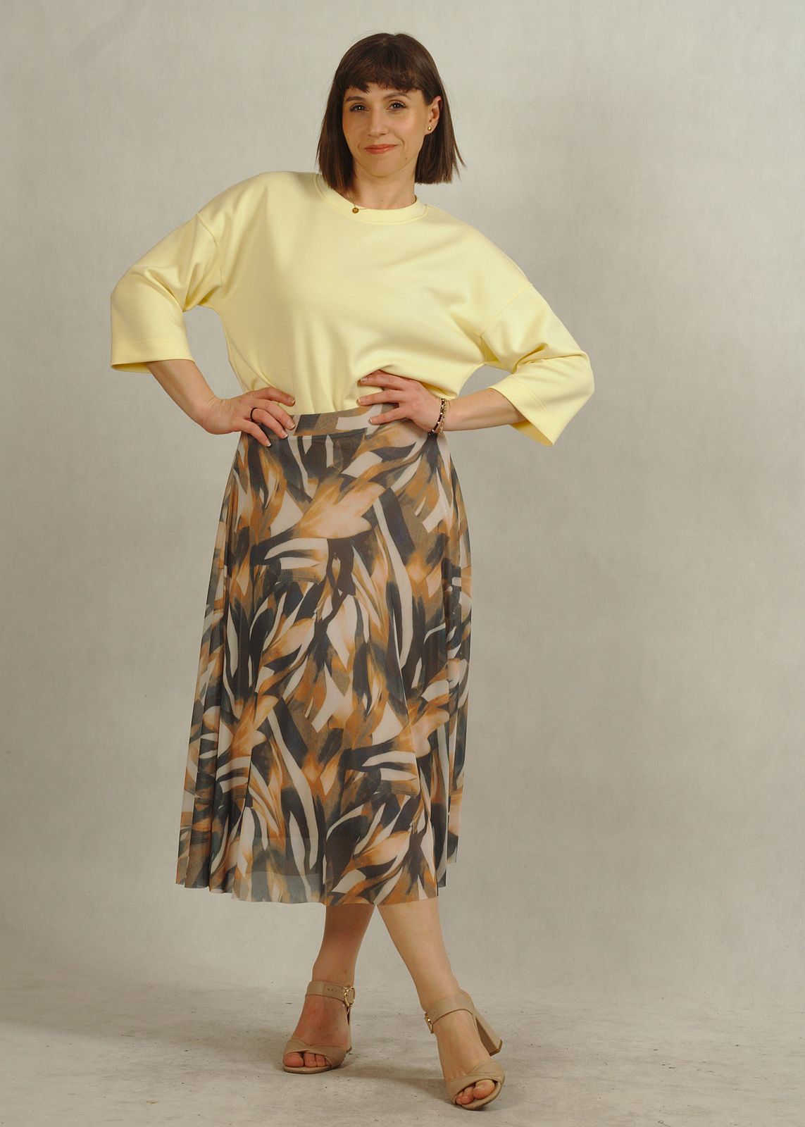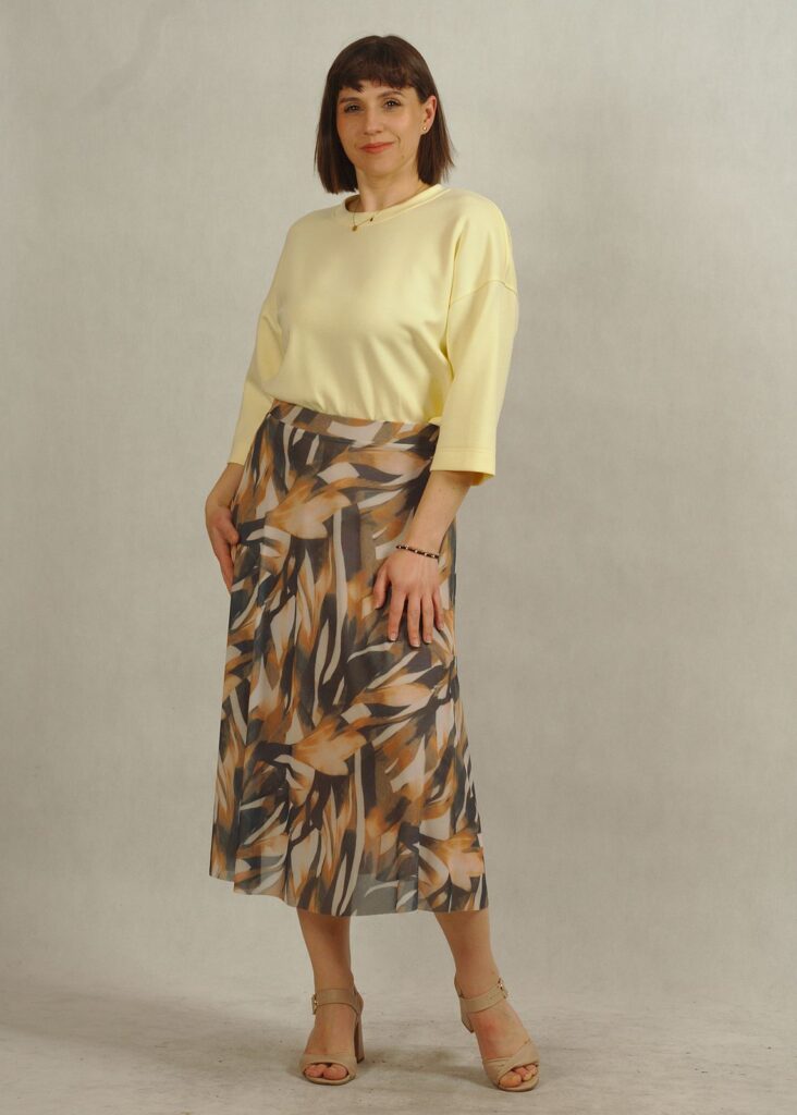 To spódnica w delikatne oliwkowe i żółte wzory na jasnym tle.