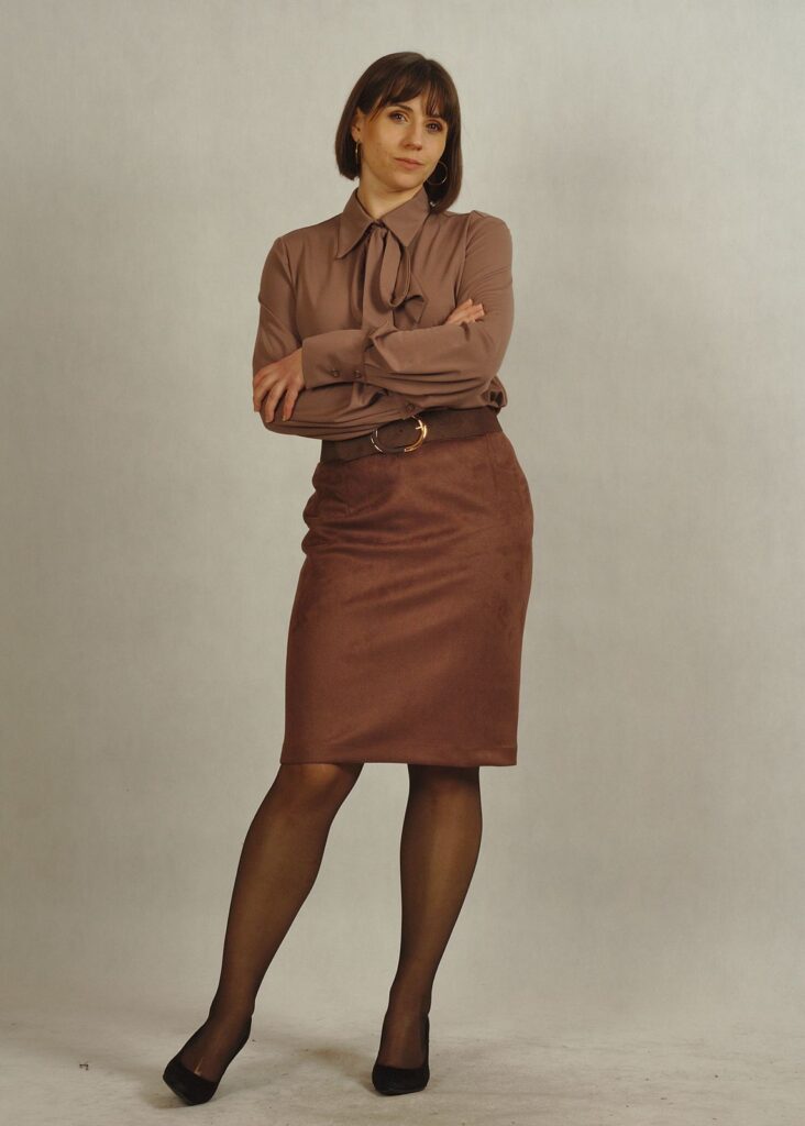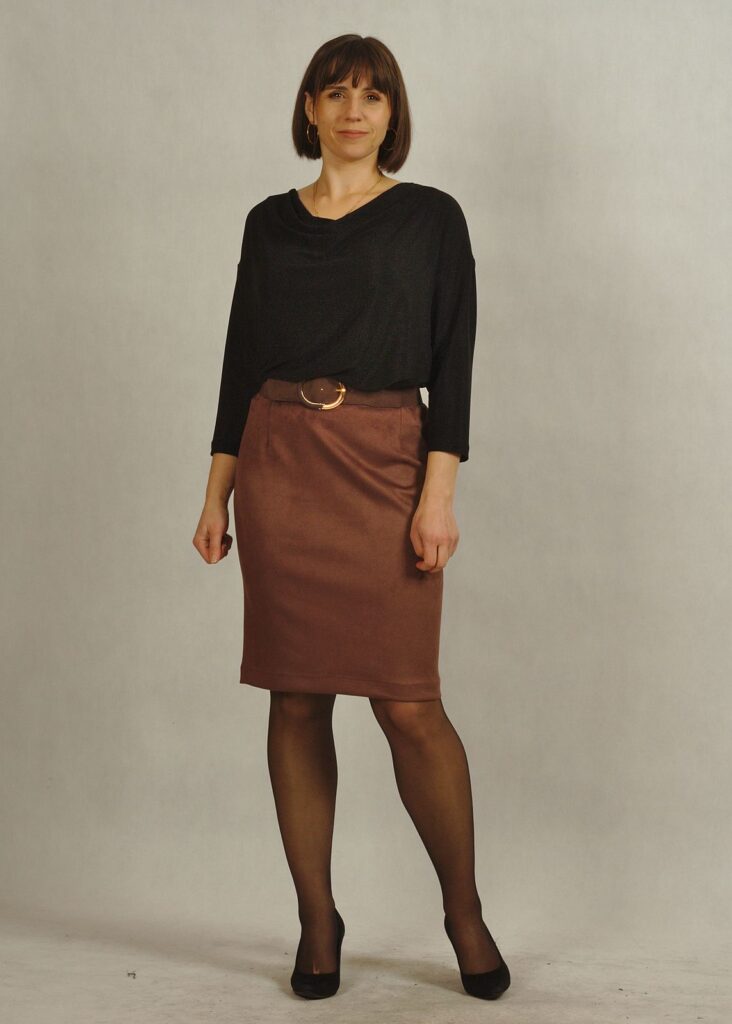 W zależności co dobierzemy na górę, ustalimy charakter spódnicy. Można dopasować do niej sweterek, bluzkę, a na to dobrać żakiet lub pasujący do niej kardigan.