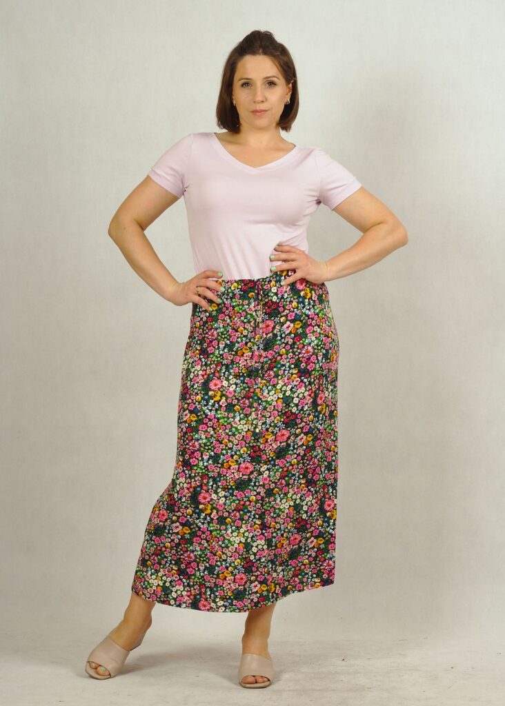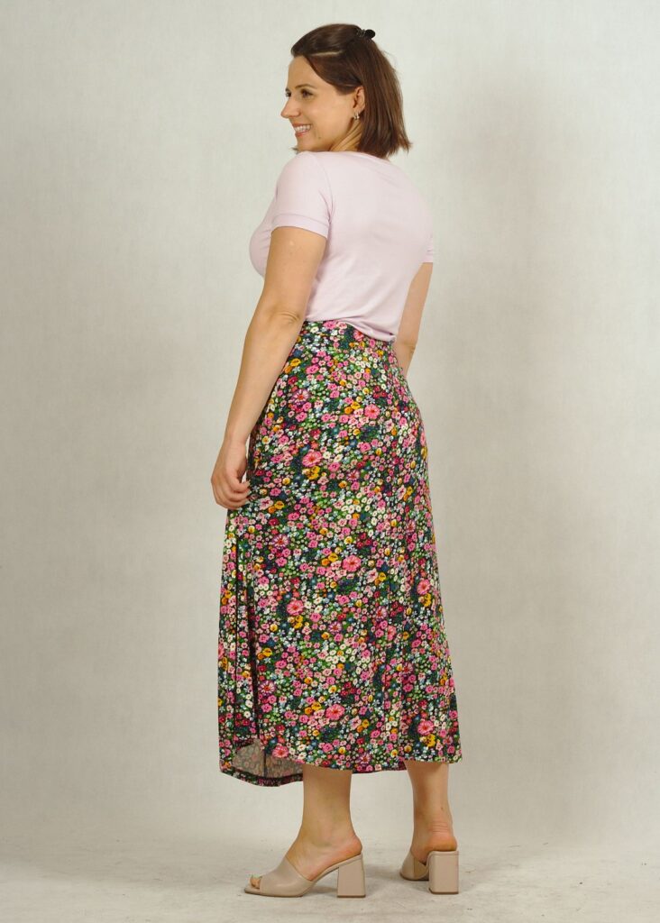Spódnica w kwiatki lubi się z eleganckimi butami – w takim zestawieniu uzyskasz elegancką stylizację.