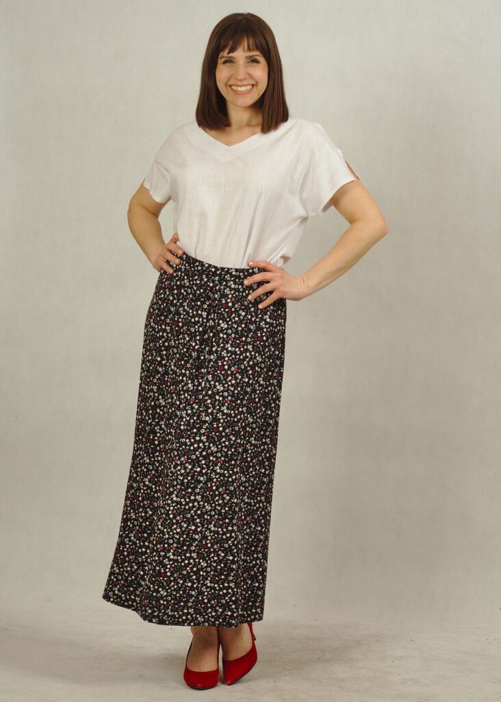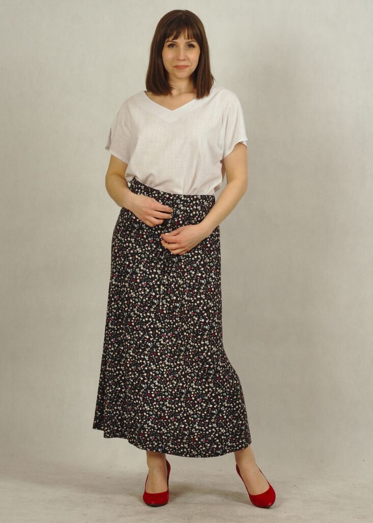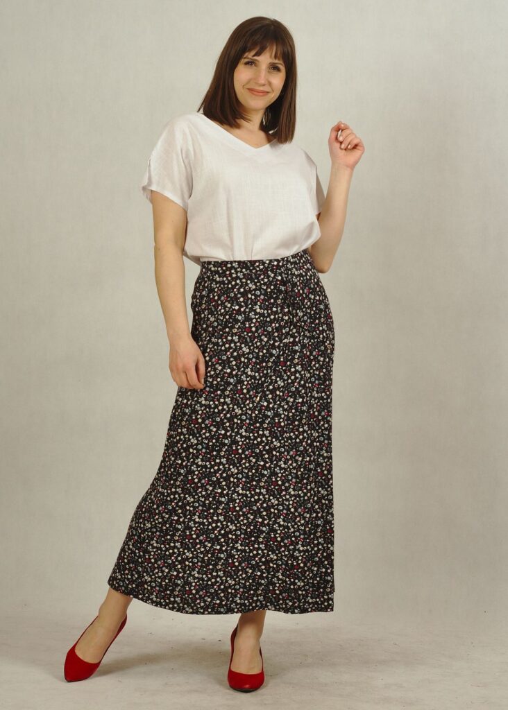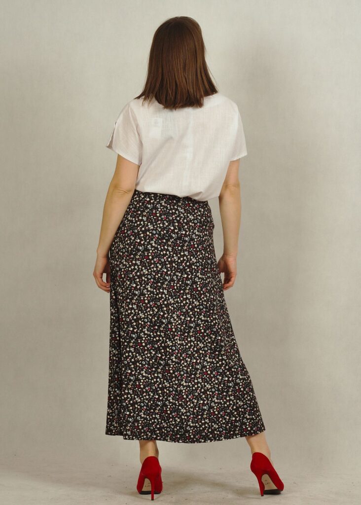 Materiał, z którego wykonano spódnicę, to wiskoza wzbogacona o elastan, dzięki czemu tkanina jest elastyczna i zapewnia wygodę ruchu.