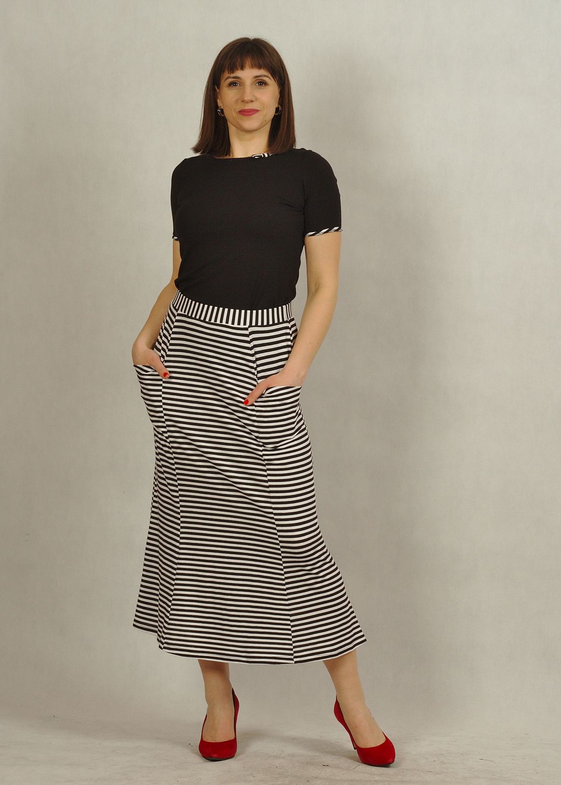 Spódnica w czarne paski optycznie wysmukla, a gumka w pasie gwarantuje wygodne dopasowanie.