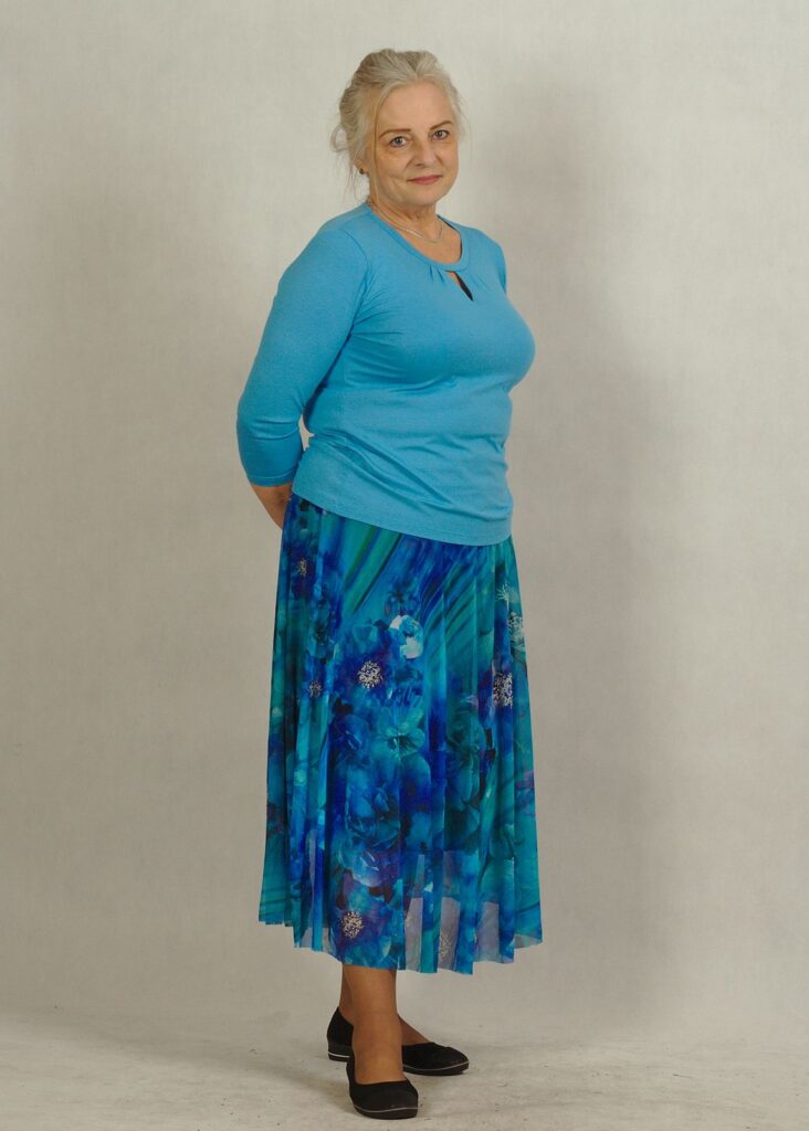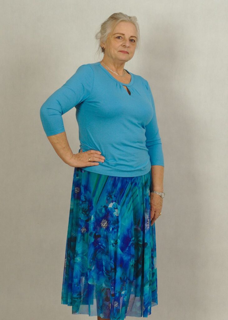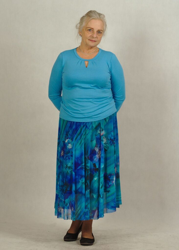 Jeśli lubisz wyraziste akcenty, niebieska spódnica w róże będzie strzałem w dziesiątkę.