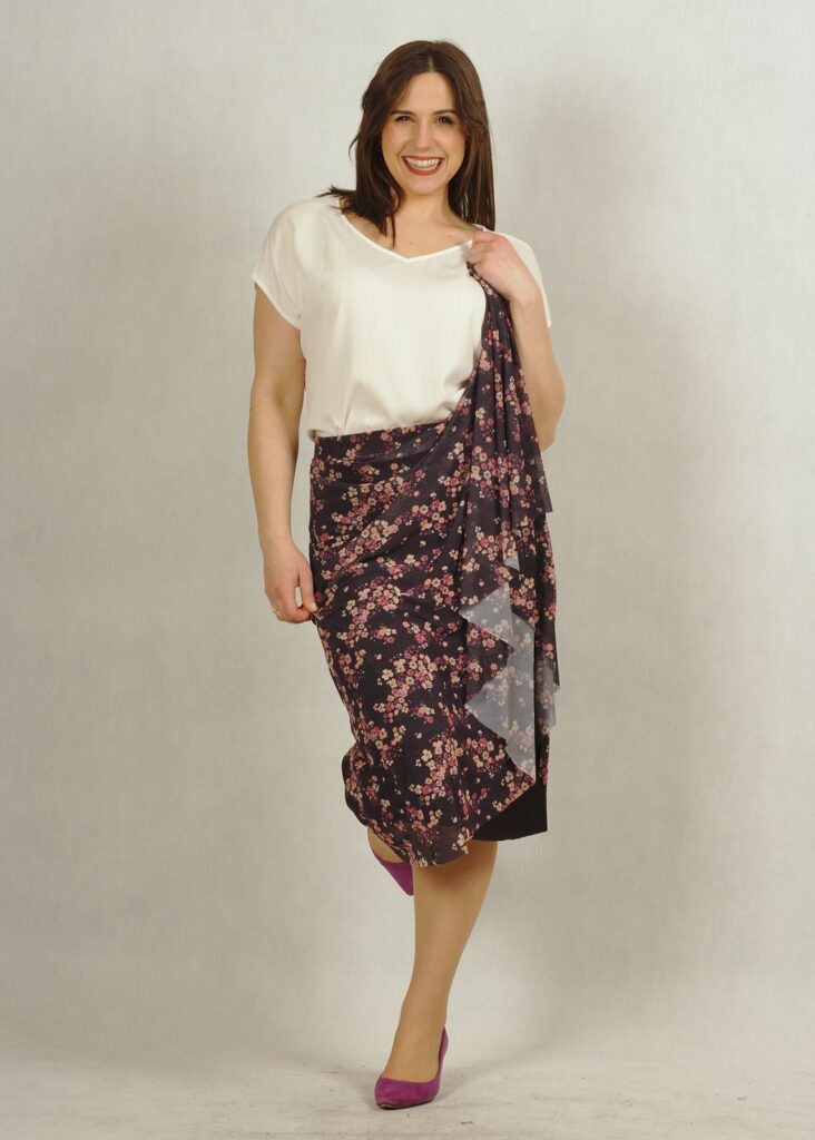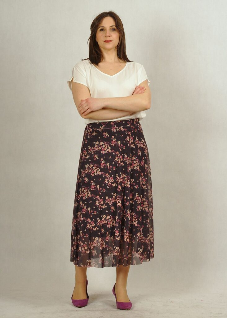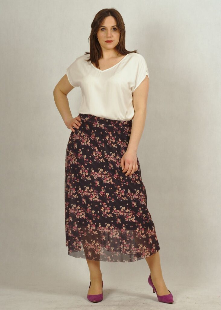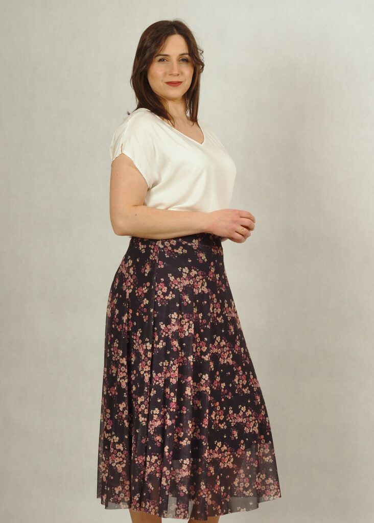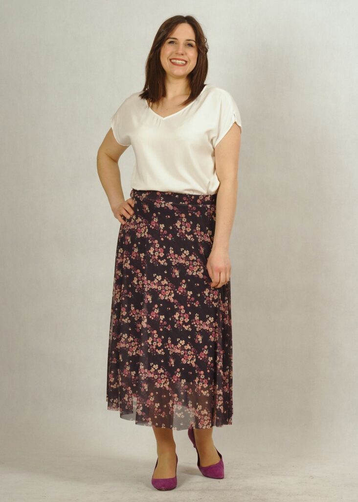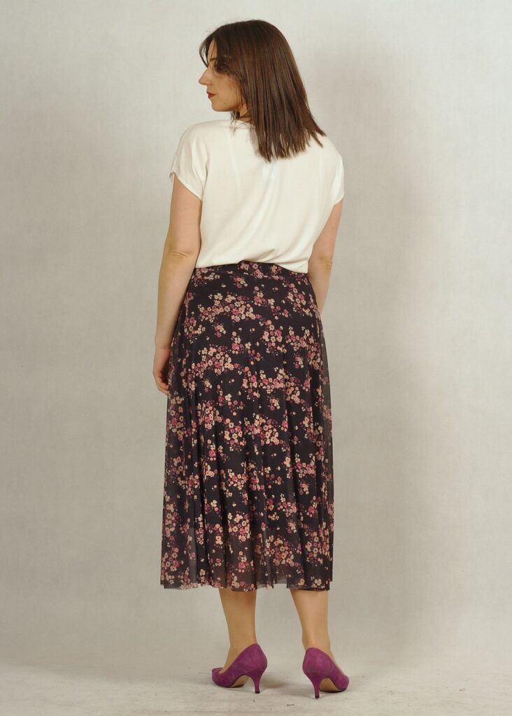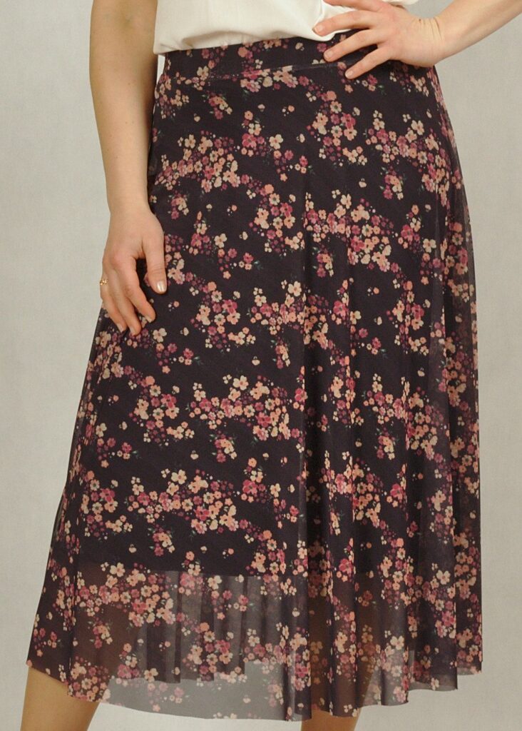 Długa spódnica składająca się z dwóch części – z wiskozowej podszewki z dzianiny oraz z poliestrowej siatki drukowanej.