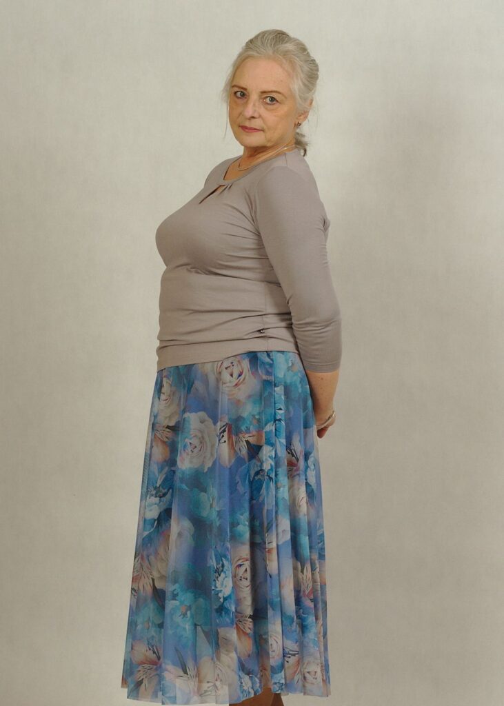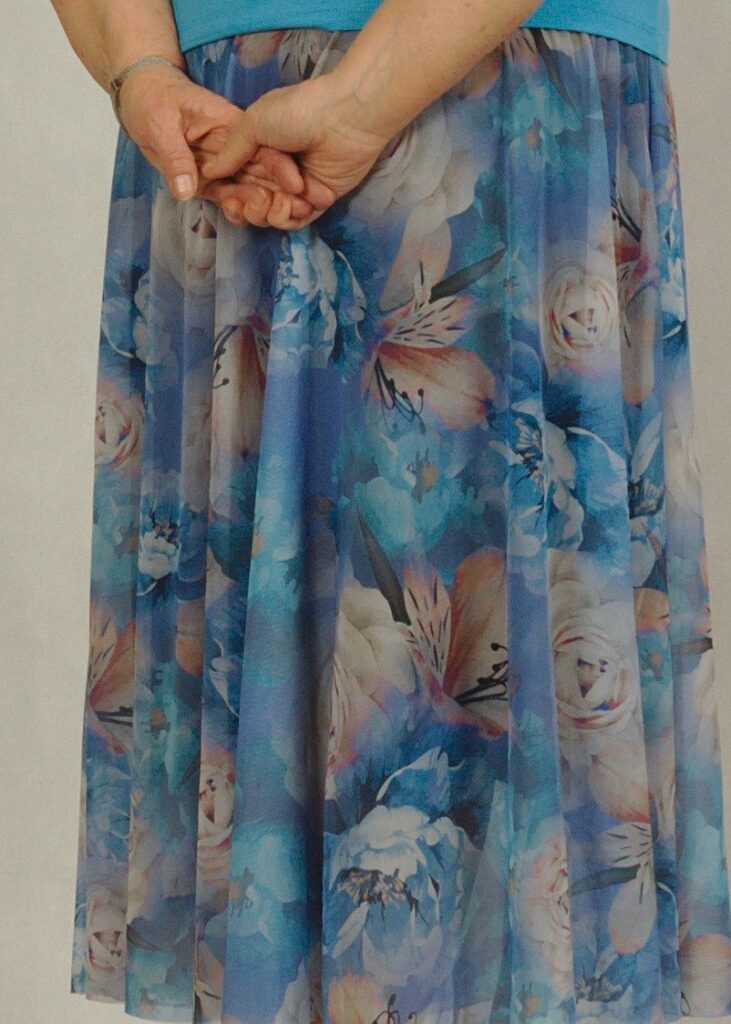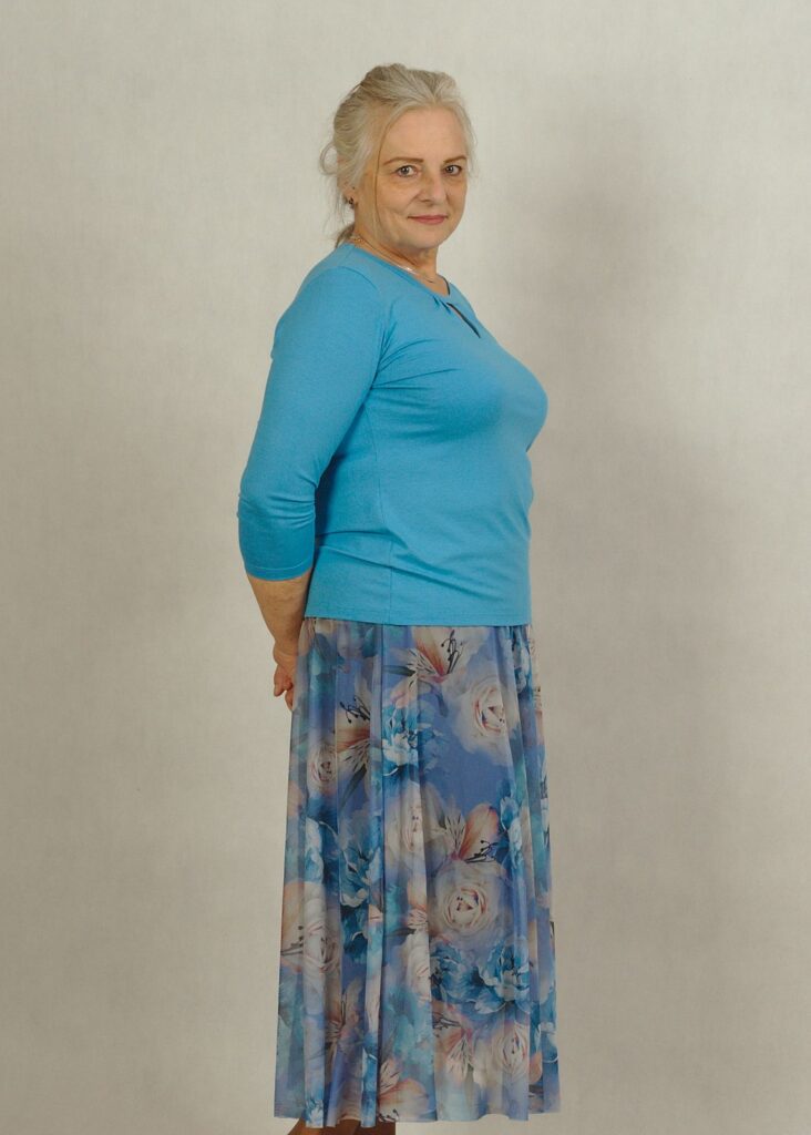 Modelka w spódnicy niebieskiej ma 164 cm wzrostu i nosi rozmiar 2XL.