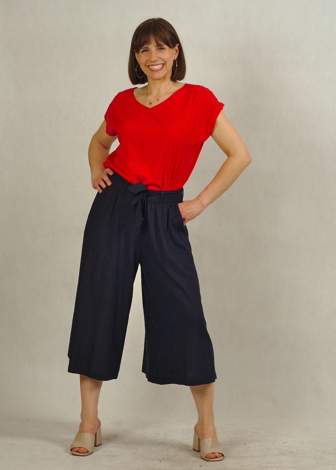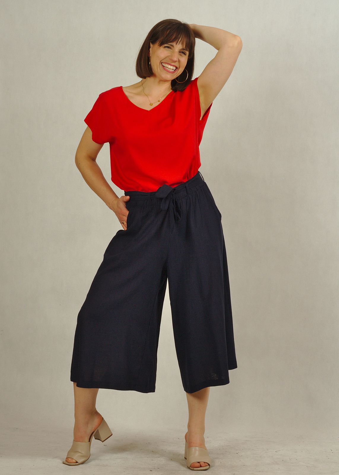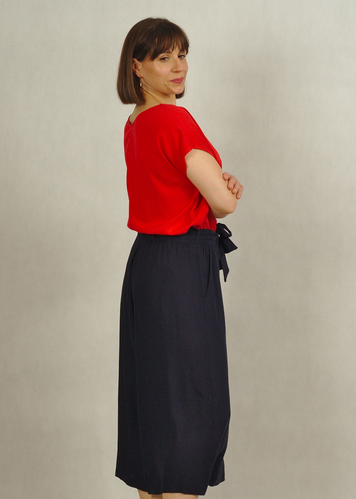 Spodnie za kolano o szerokich nogawkach świetnie prezentują się w ruchu, tworząc efekt spódnicy.