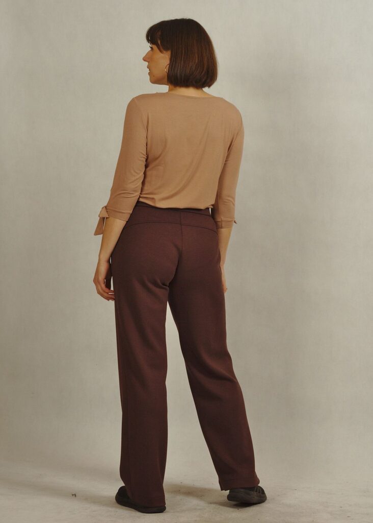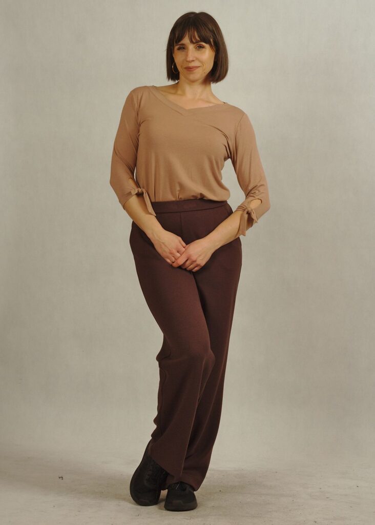 Czarne wykończenie sprawia, że to ponadczasowe brązowe spodnie, które łatwo połączysz z ulubionymi bluzami, t-shirtami czy kardiganami.