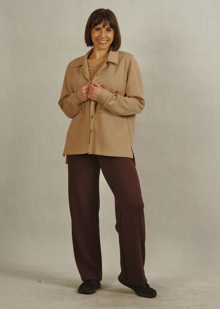 Modna, lekko luźna forma oraz spodnie z szeroką nogawką pozwalają stworzyć stylowy i swobodny look.