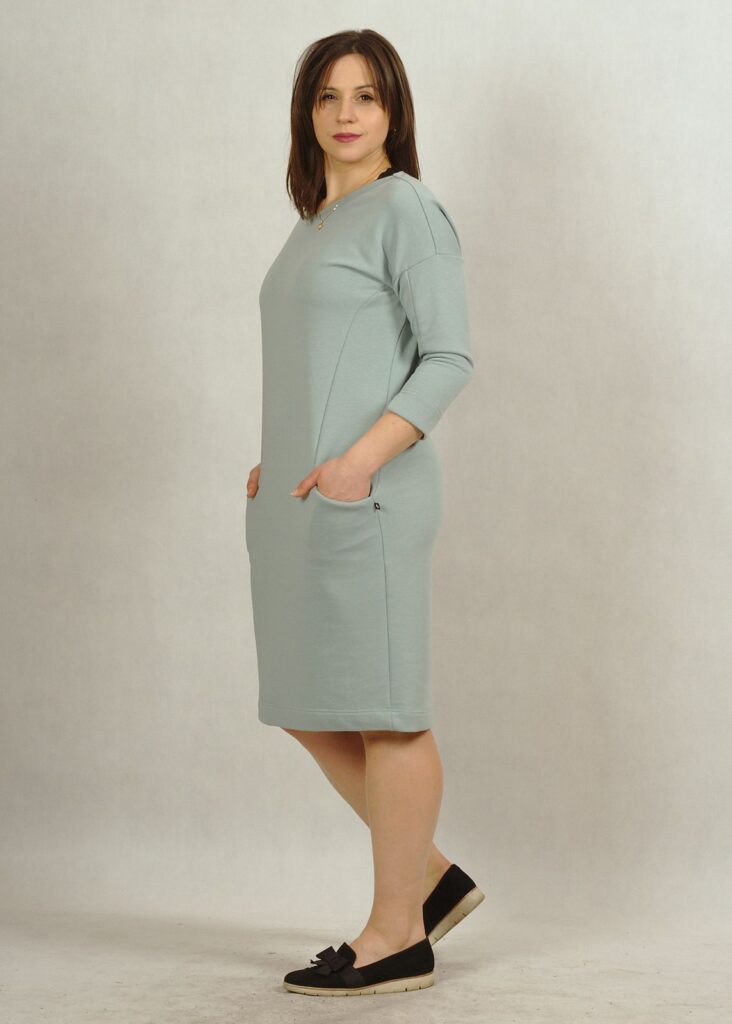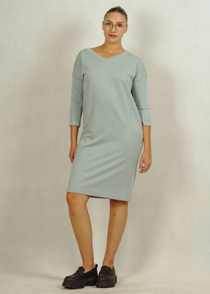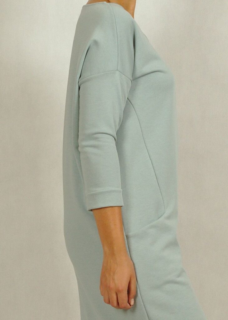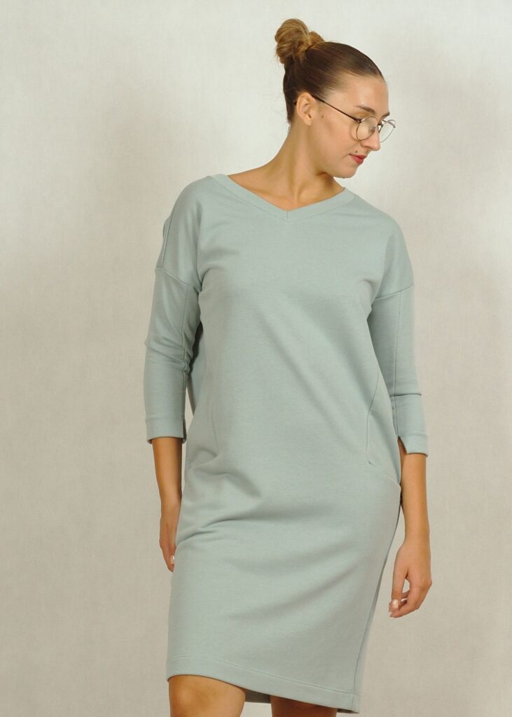 Sukienka ma klasyczny dekolt w serek, opadający rękaw typu kimono o długości 7/8. Delikatnie zwężany w stronę przedramienia.