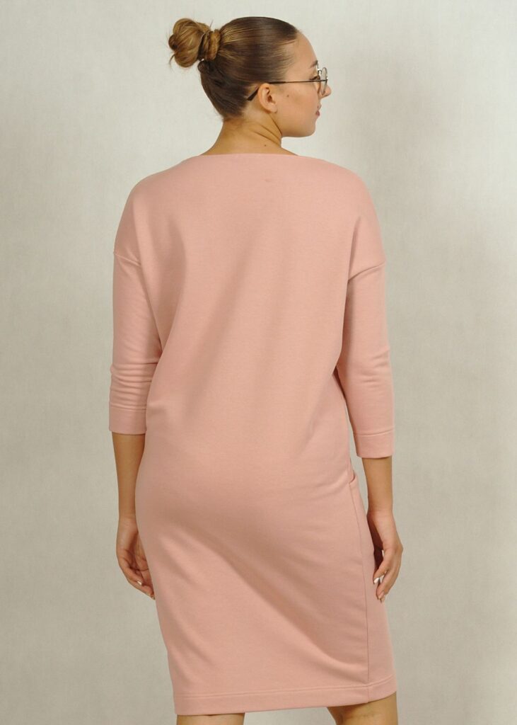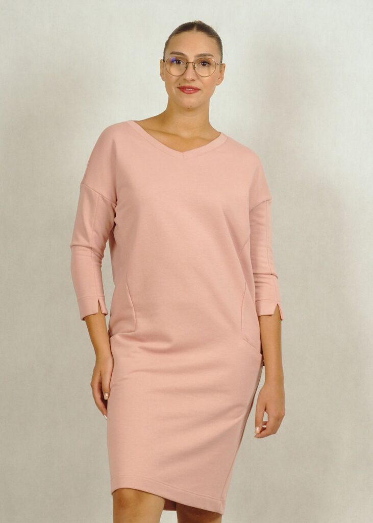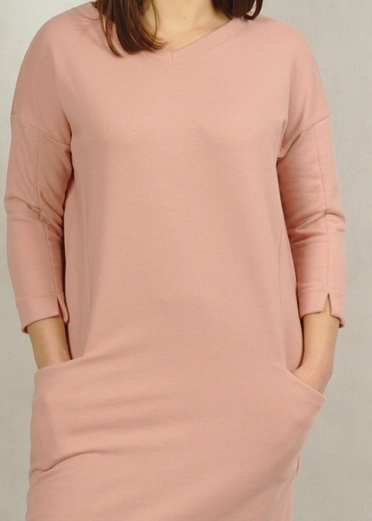 Sukienka ma klasyczny dekolt w serek, opadający rękaw typu kimono o długości 7/8. Delikatnie zwężany w stronę przedramienia.