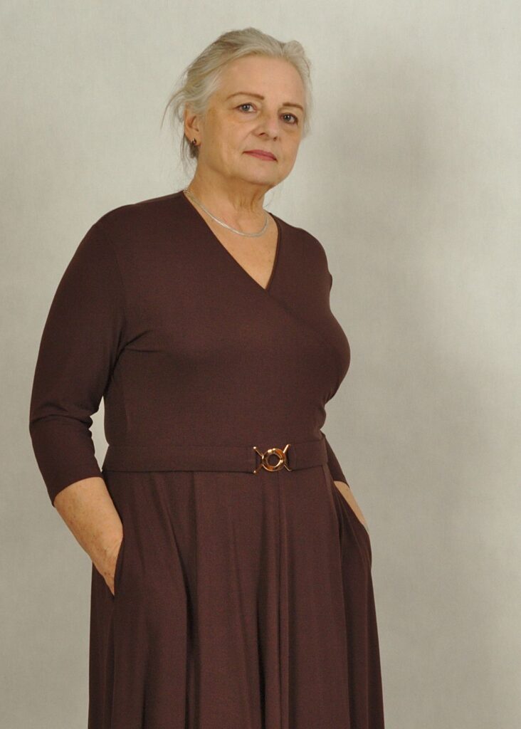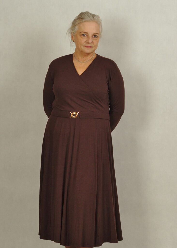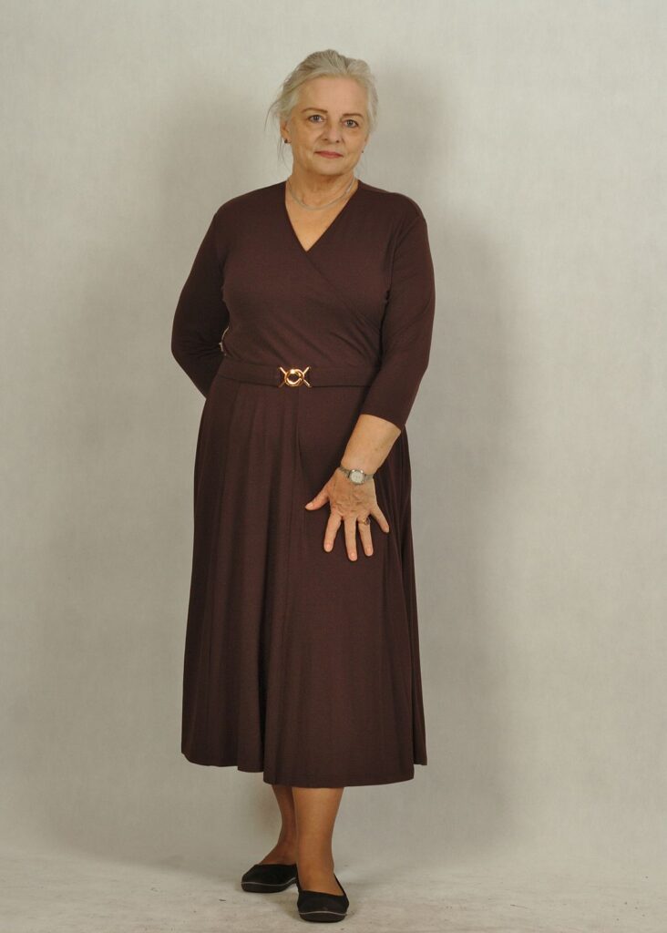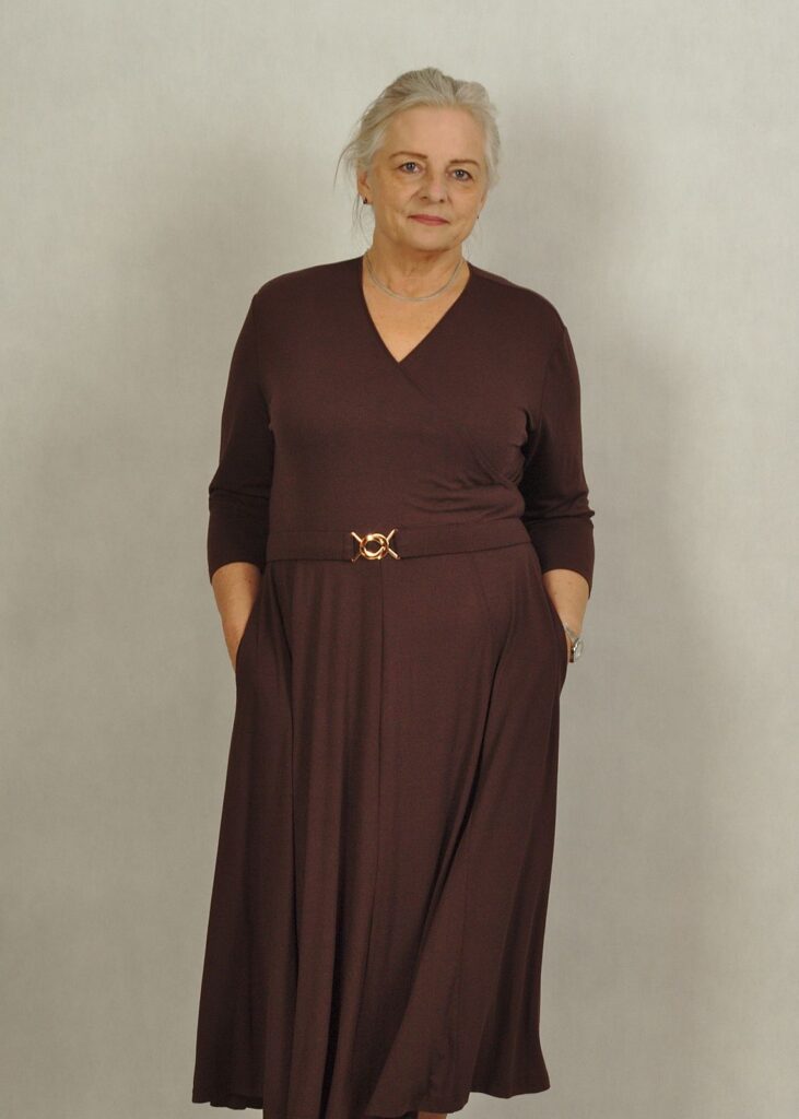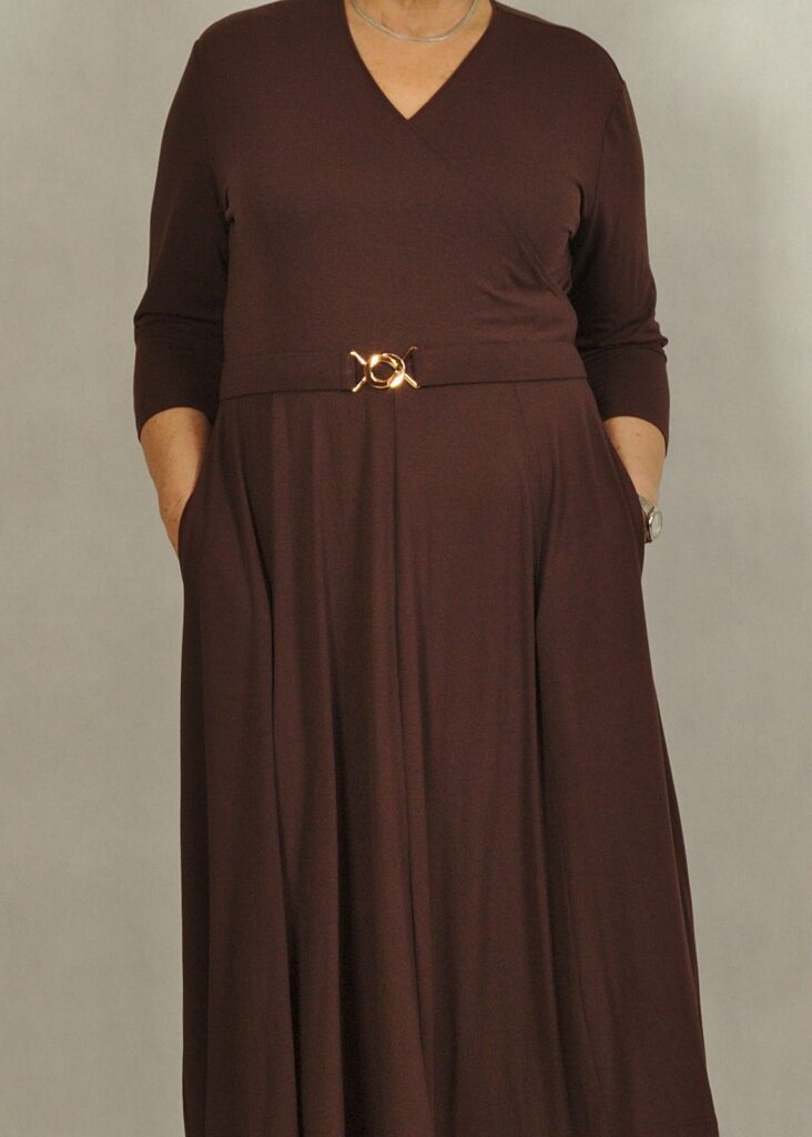 Sukienka brązowa z kopertowym dekoltem, który pięknie eksponuje biust i wysmukla sylwetkę.