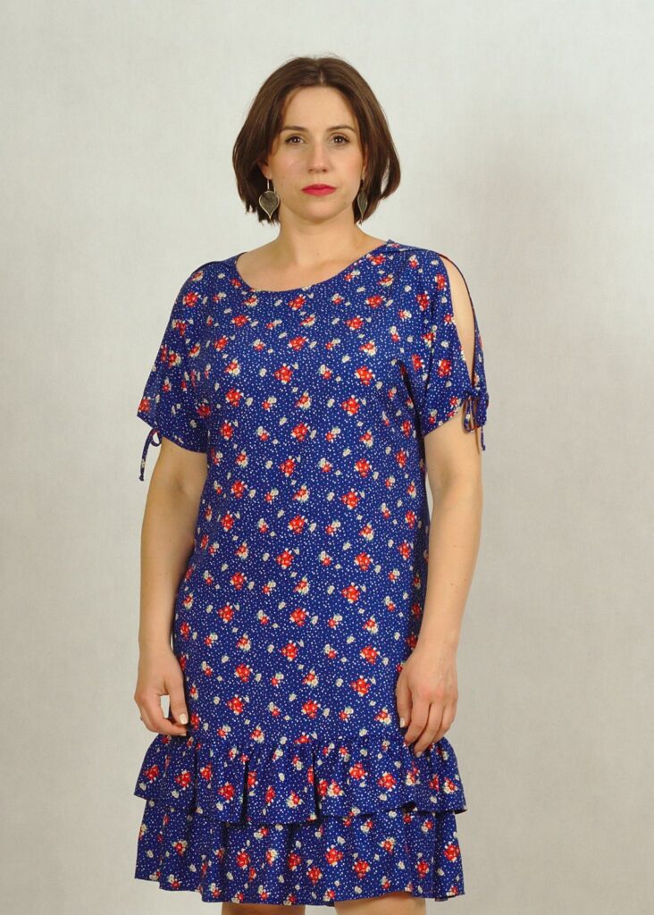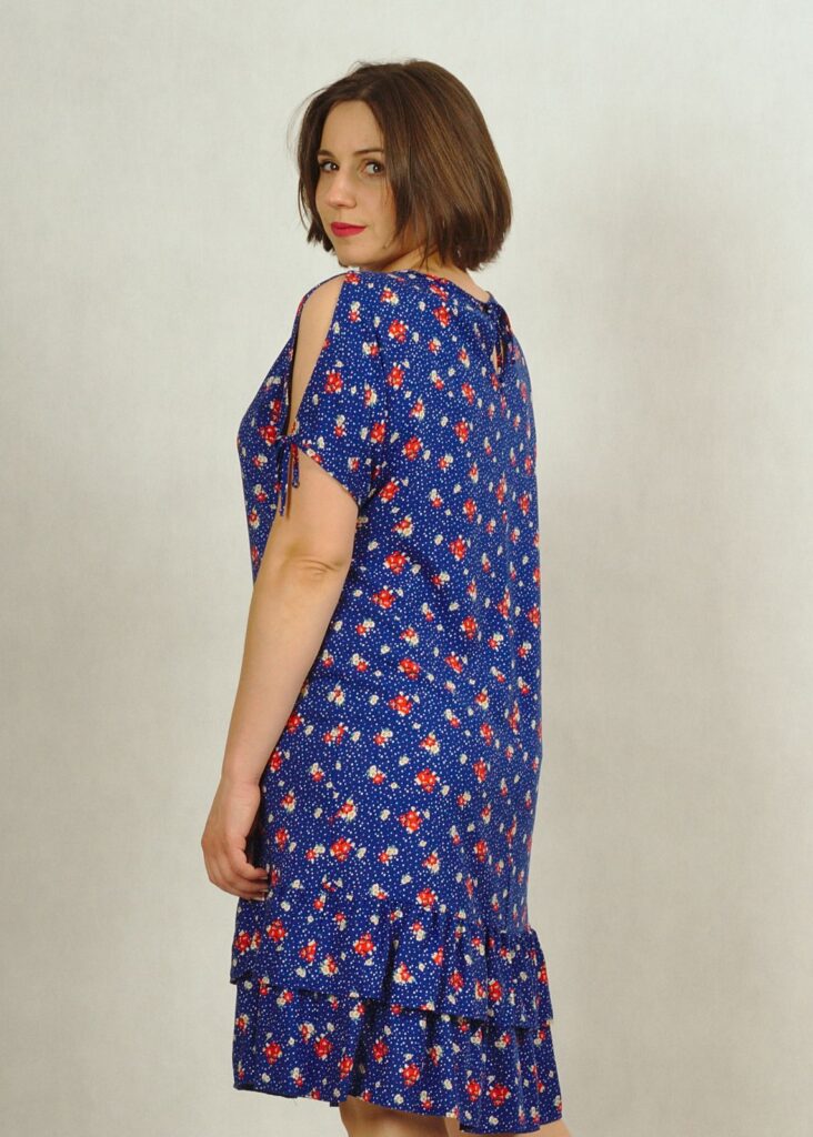Sukienka chabrowa z falbanką i rozcięciem na ramieniu plus size /626/