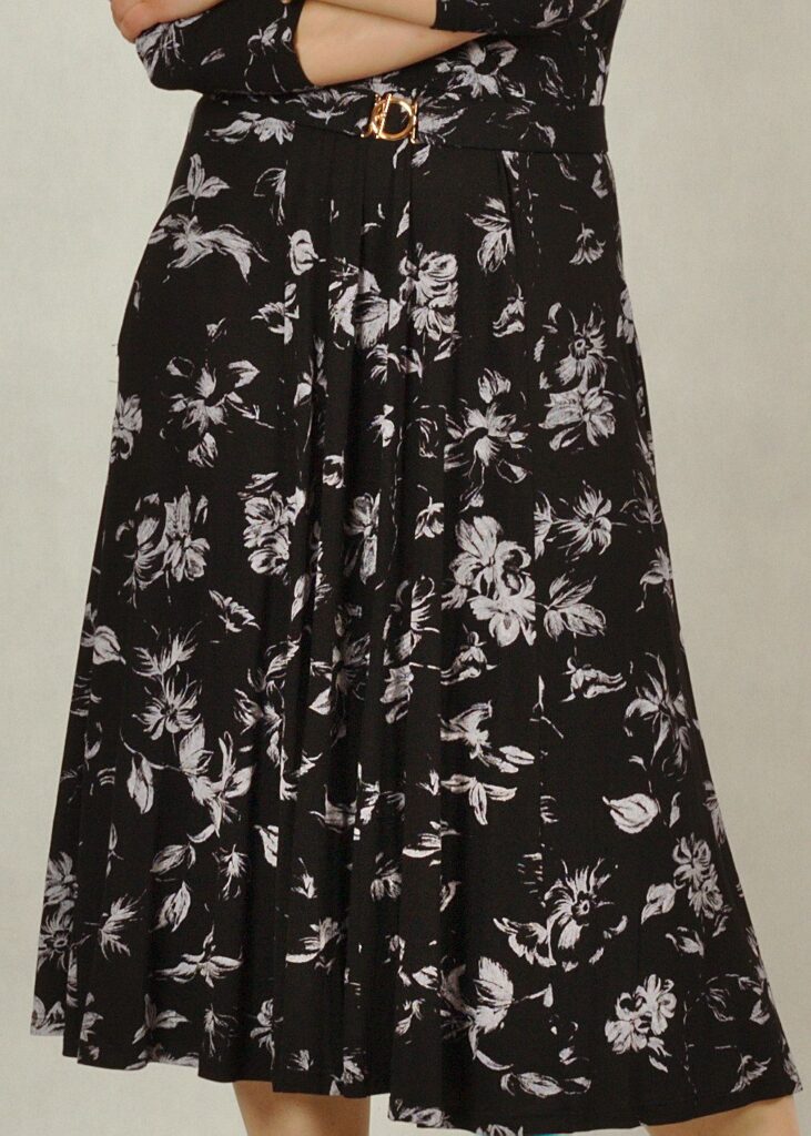 Sukienka ma kolor czarny* z białymi kwiatami i listkami, materiał jest bardzo trwały.