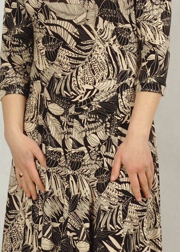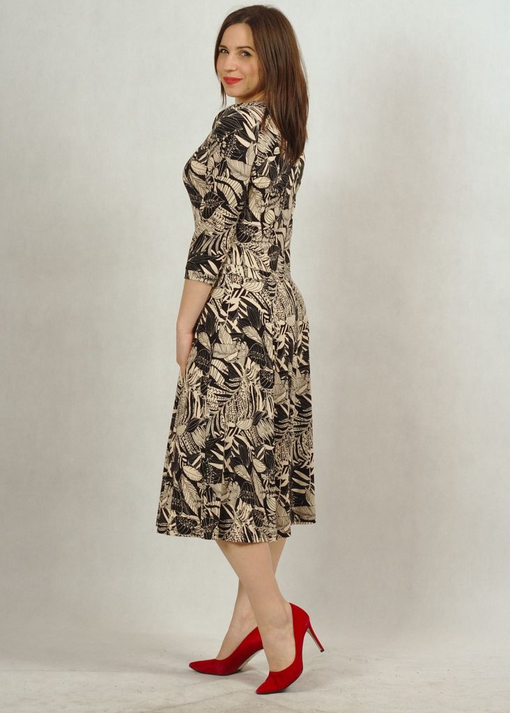 Góra sukienki jest prosta, klasyczna, z rękawem za łokieć i dekoltem w piękny serek.