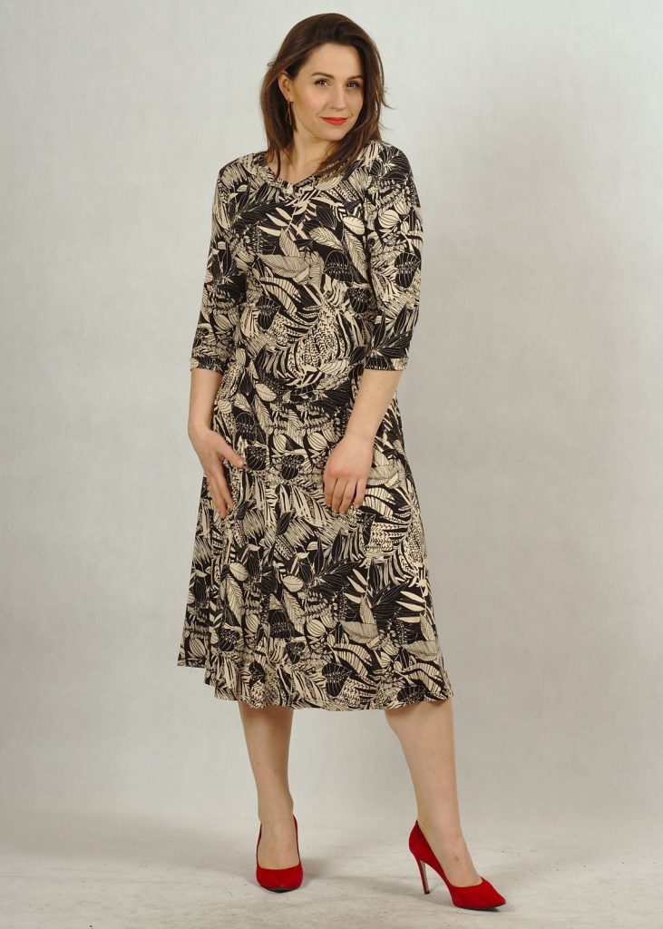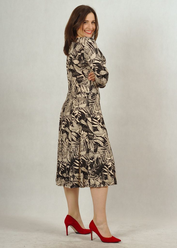 Dół sukienki lekko poszerzany, wyprofilowany cięciami.