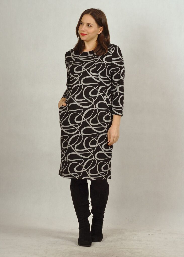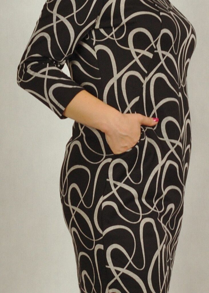 Sukienka ma dwa przeszycia od dekoltu w stronę bioder, na końcu których znajdują się kieszonki. Pięknie wysmukla sylwetkę!