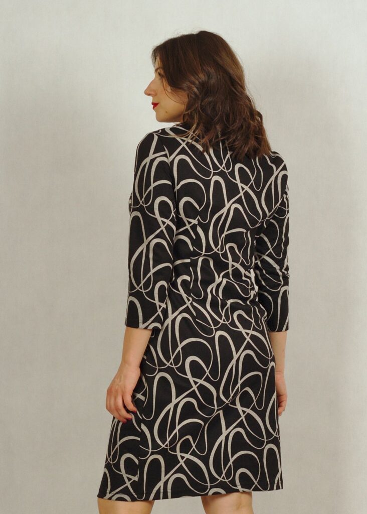 Rękaw w sukience ma długość 3/4, która świetnie optycznie wysmukla ręce.
