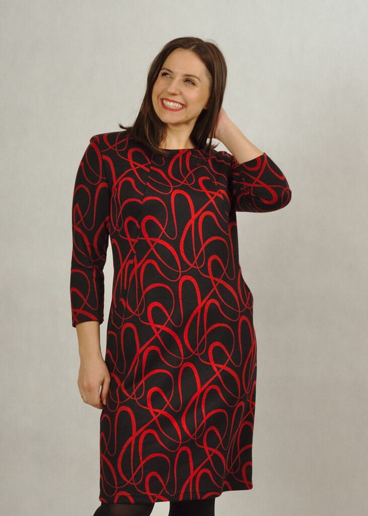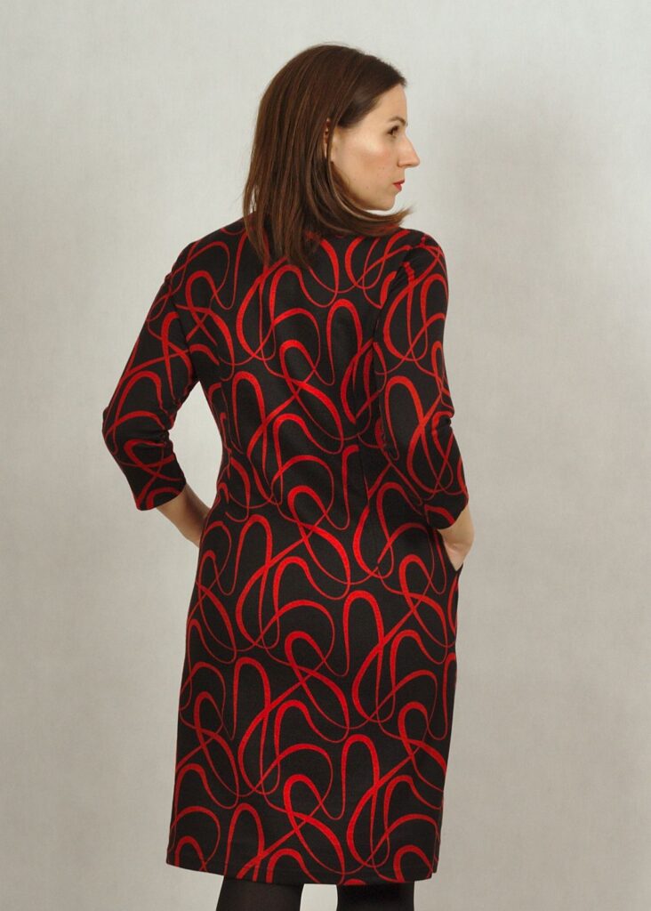 Sukienka ma dwa przeszycia od dekoltu w stronę bioder, na końcu których znajdują się kieszonki. Pięknie wysmukla sylwetkę!