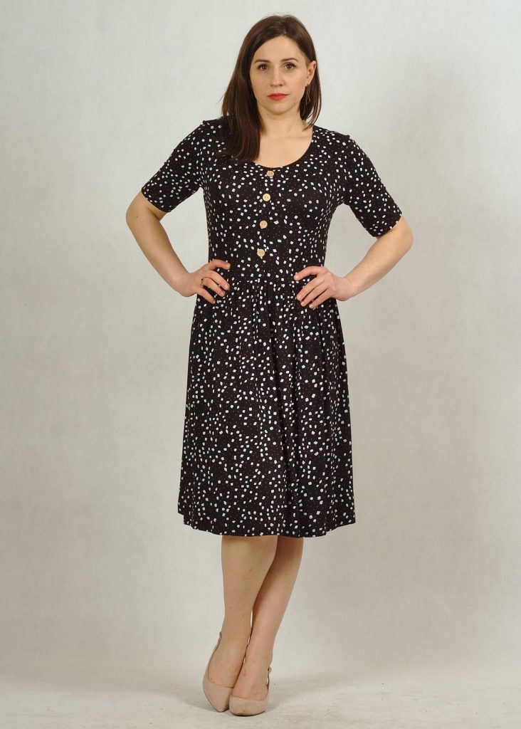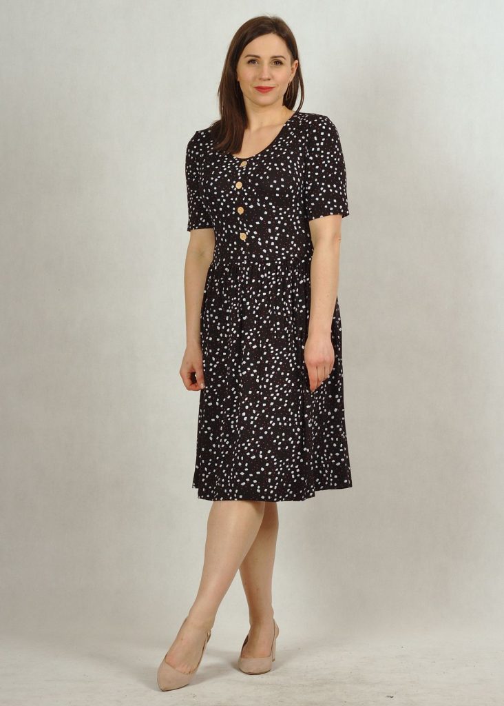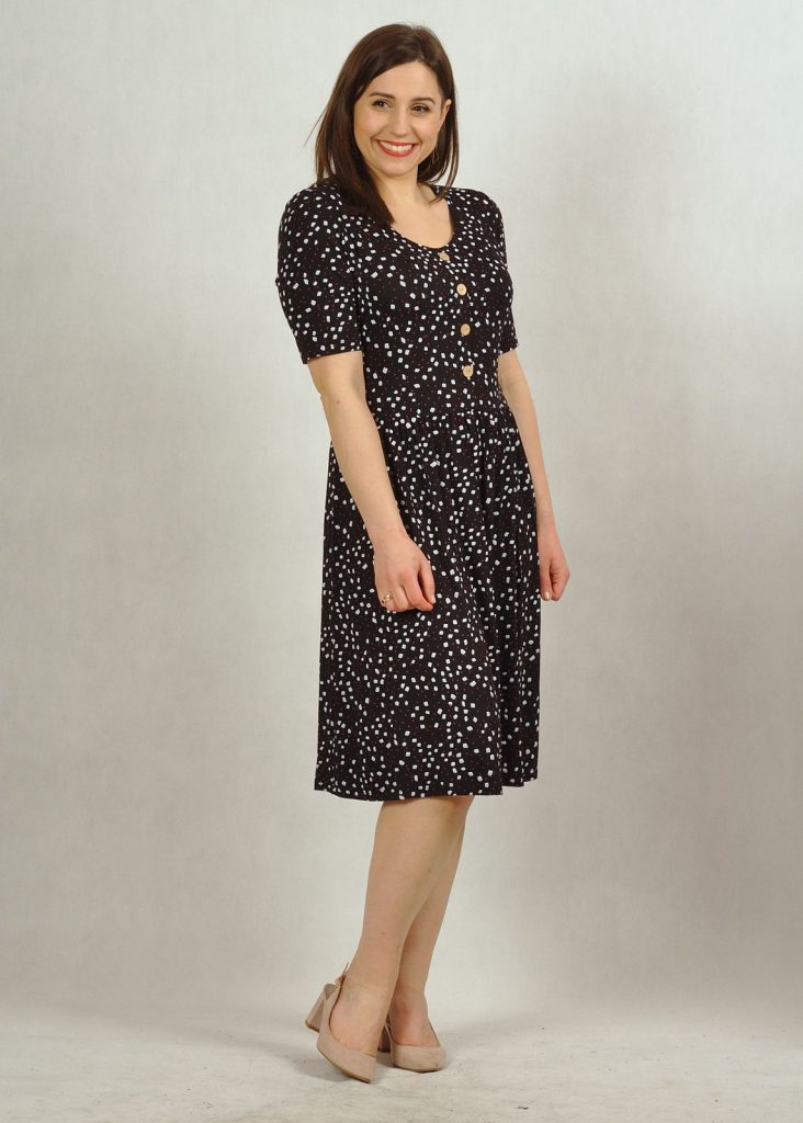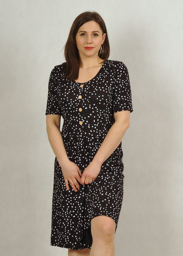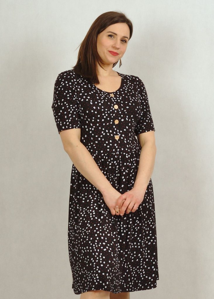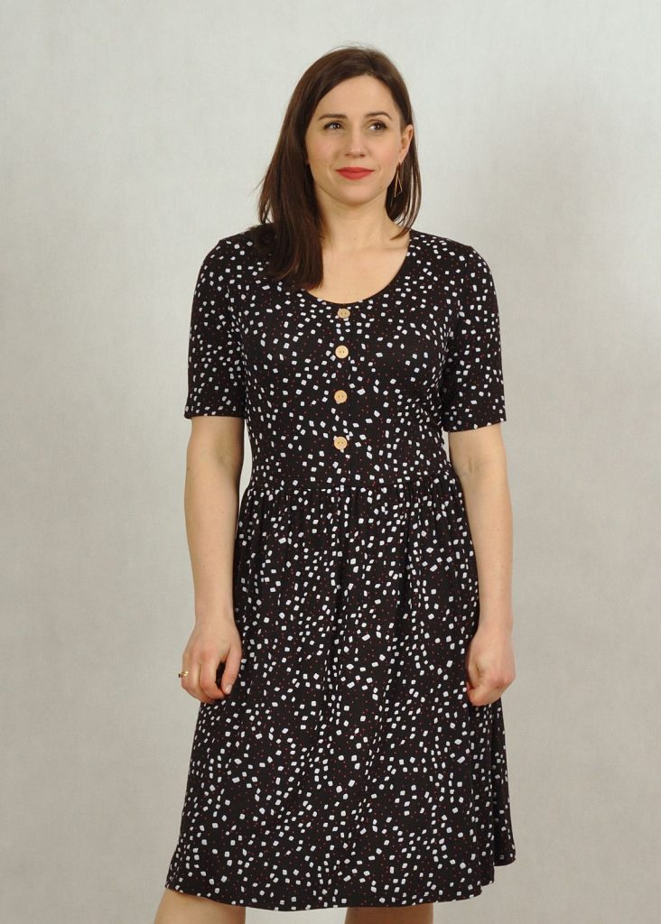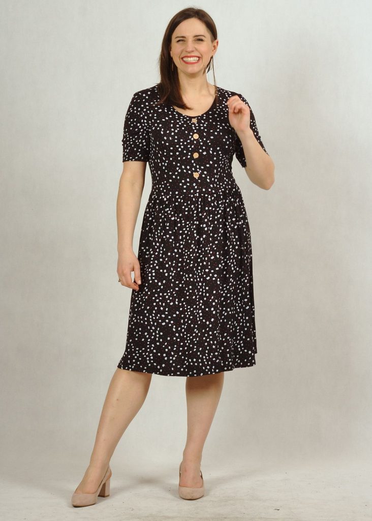 Niezwykle wygodna sukienka dzianinowa na krótki rękaw. Posiada półokrągły dekolt ozdobiony czterema “kokosowymi” guziczkami.