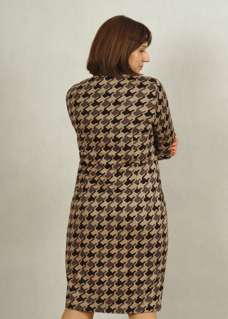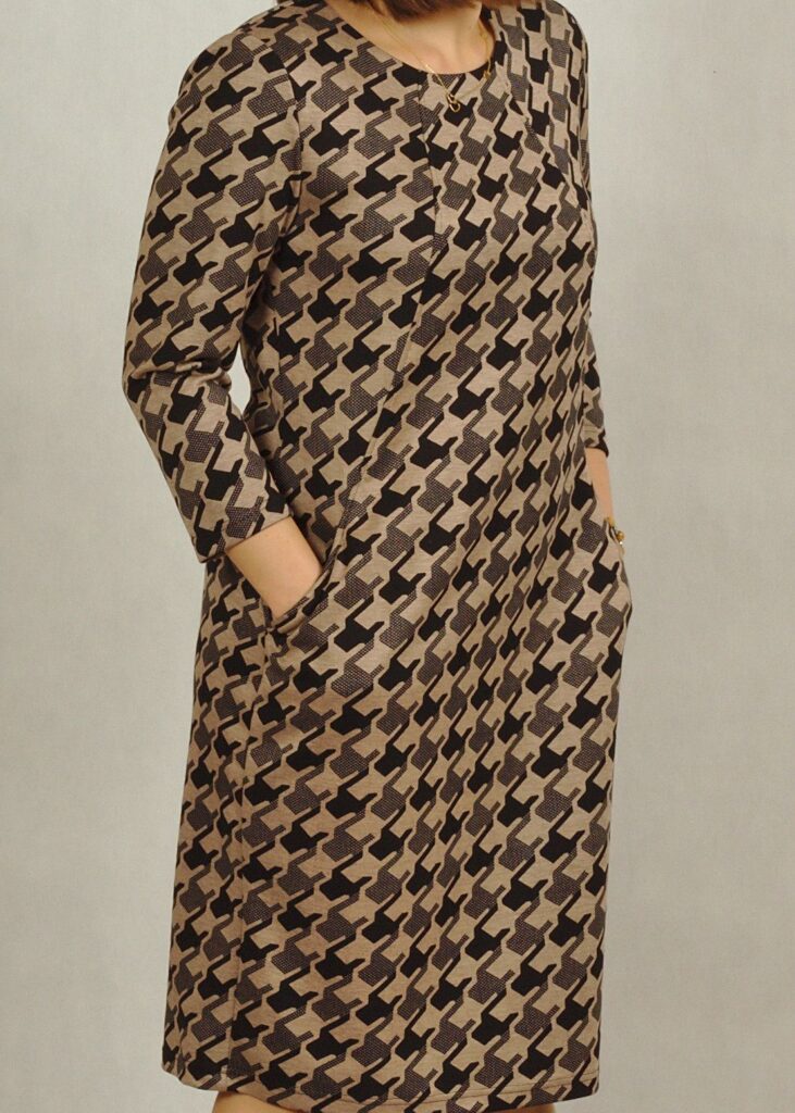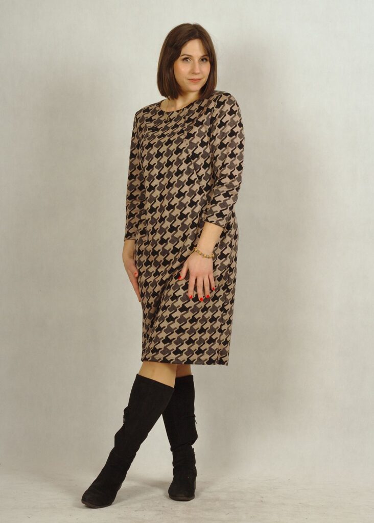 Sukienka we wzory – delikatna pepitka w kolorach czarnym i beżowym, z przewagą czerni.
