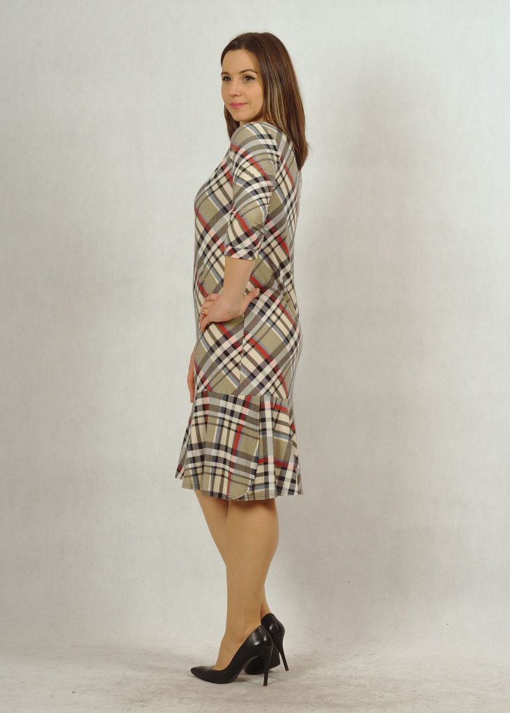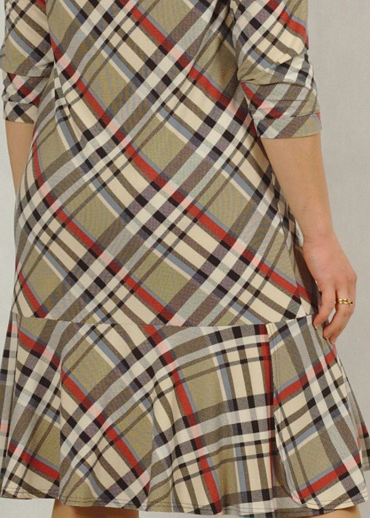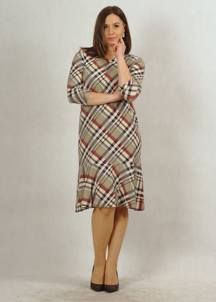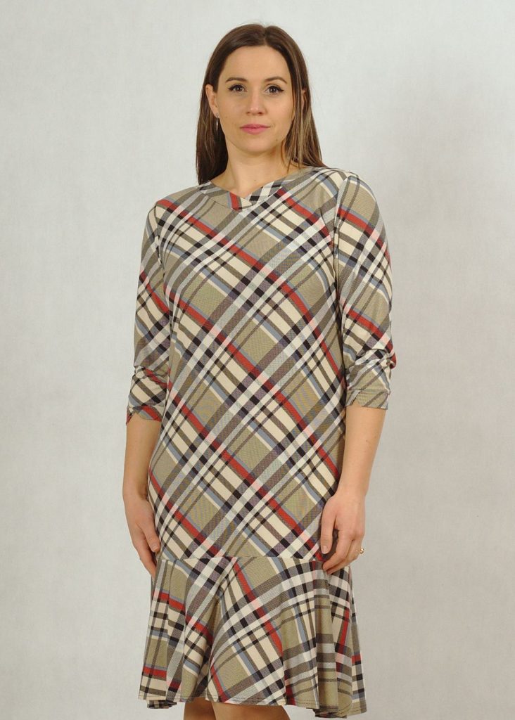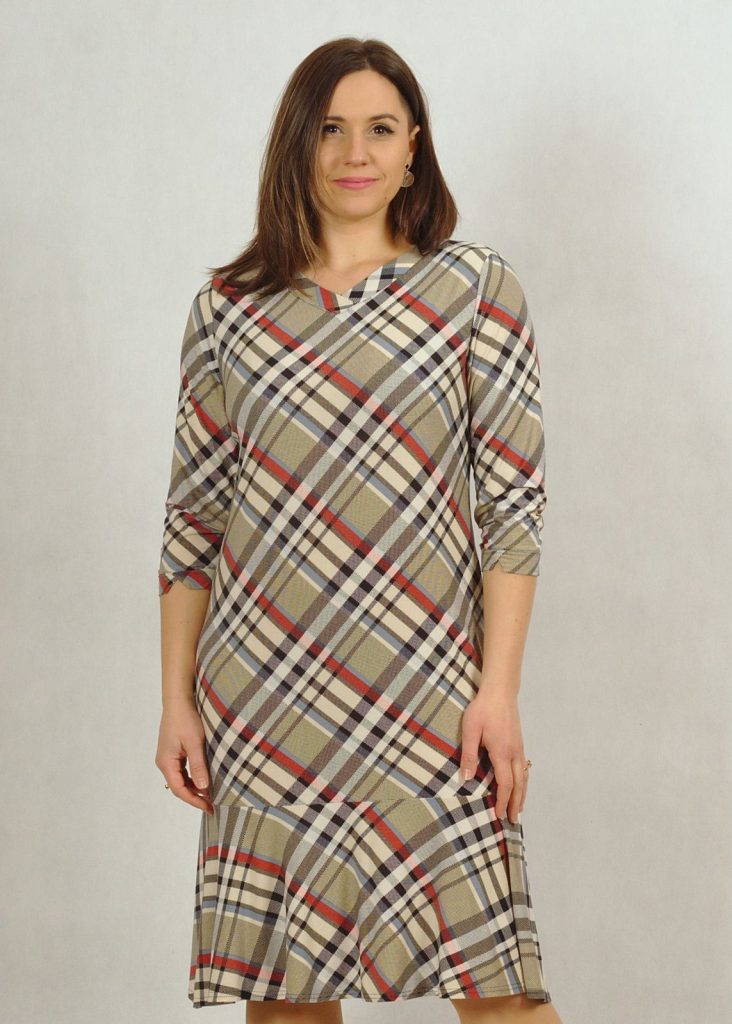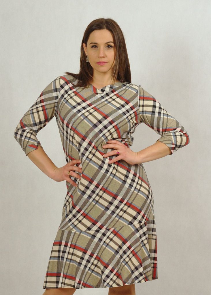 Sukienka wykonana jest z bardzo przyjemnej w dotyku dzianiny wiskozowej. Pozwoli Ci ona czuć się bardzo swobodnie i komfortowo. Ten typ materiału nie gniecie się, co jest niebywałym atutem. Kolory są stonowane, a krata bardzo subtelna. Występuje w dwóch wersjach kolorystycznych: niebieskiej i beżowej*. Masz możliwość wyboru, by czuć się tak jak lubisz najlepiej. Sukienka ma klasyczny dekolt w serek, rękaw 3/4, wykończony delikatną zakładką materiału, jak przy dekolcie. Dbamy o detale dla Ciebie 🙂