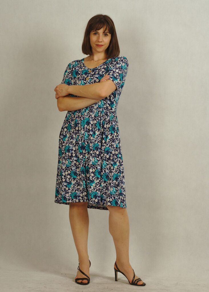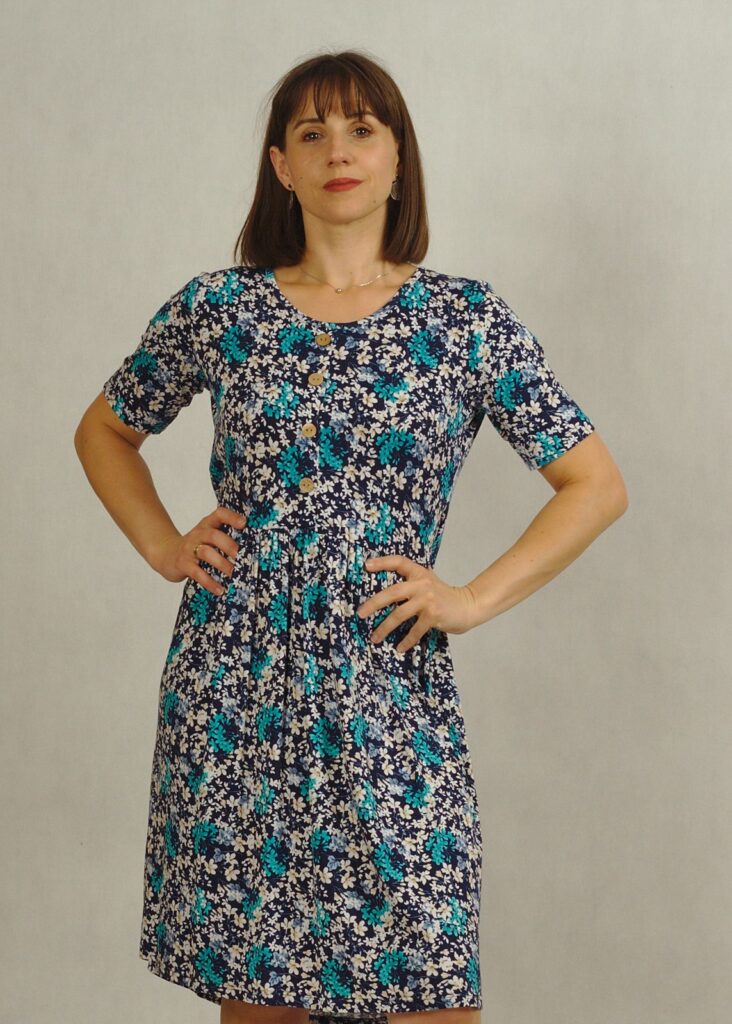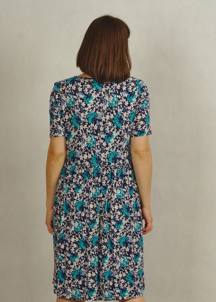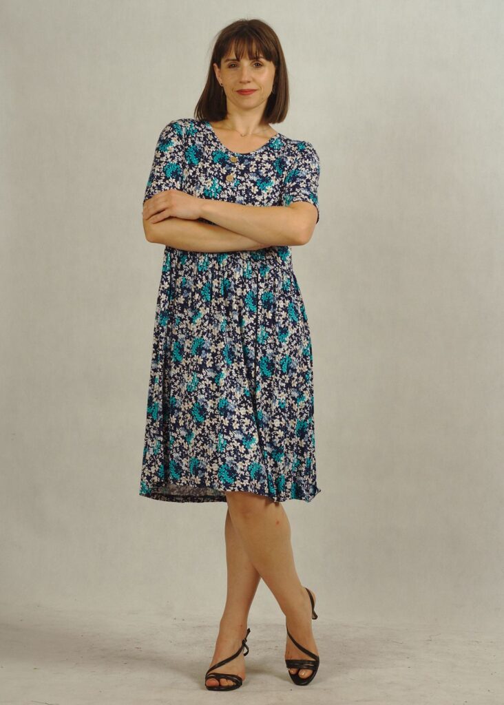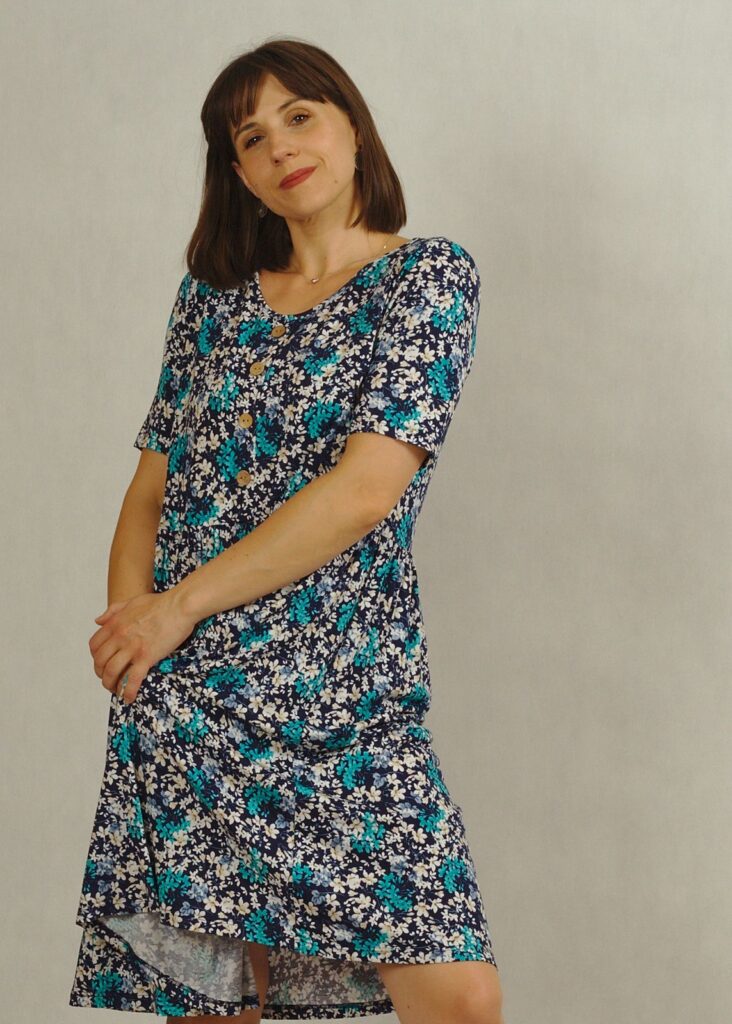 Sukienka z dzianiny w turkusowe kwiatki pięknie podkreśla figurę, a fason odcinany w pasie modeluje sylwetkę, zapewniając wygodę na co dzień. Sukienka z krótkim rękawem i guzikami to praktyczne rozwiązanie zarówno do pracy, jak i na wakacyjne spacery.