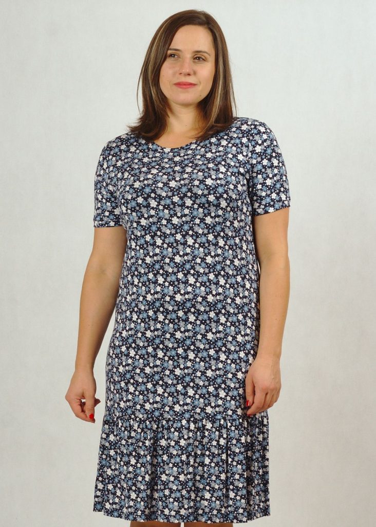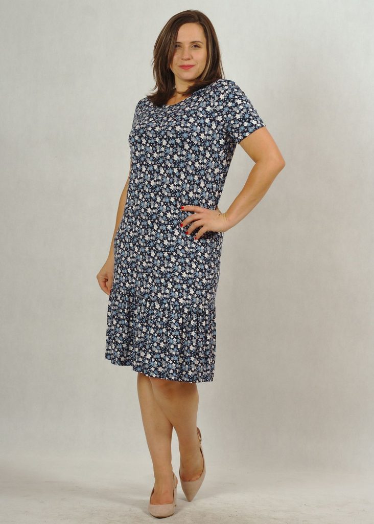 Sukienka dzianinowa z falbanką granatowa w drobne kwiatki plus size /627/