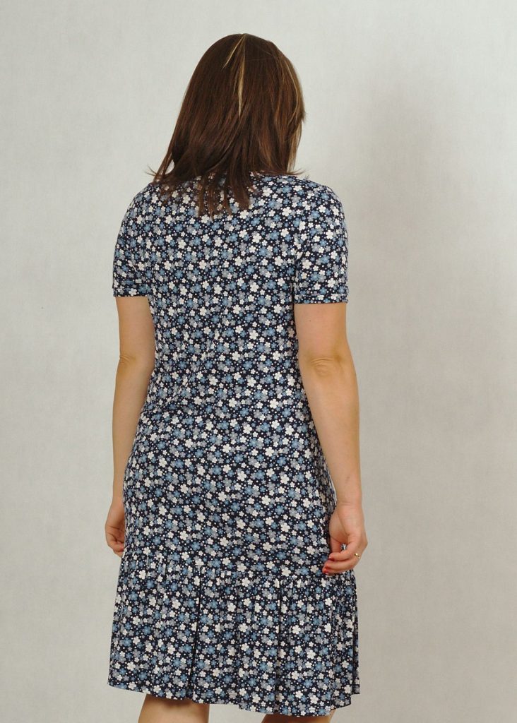 Dzianinowa, wiskozowa sukienka granatowa w białe, błękitne i szare kwiatuszki.