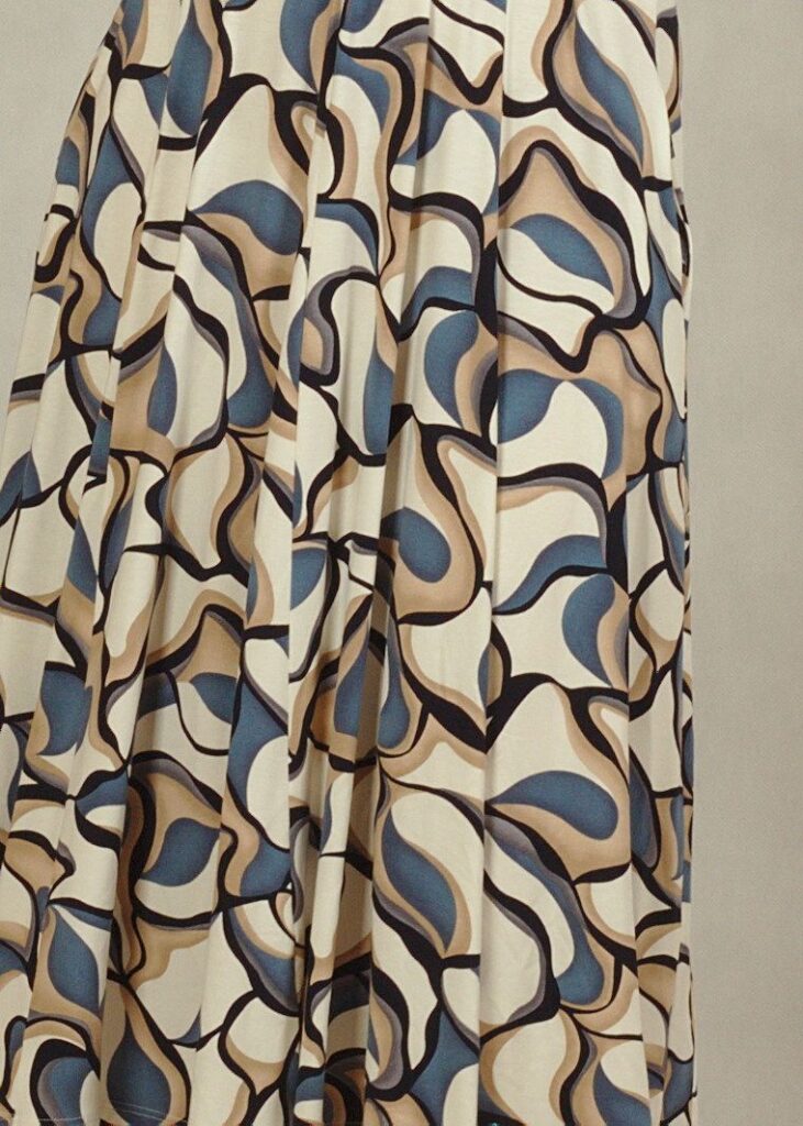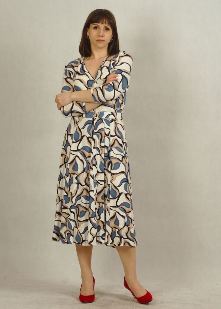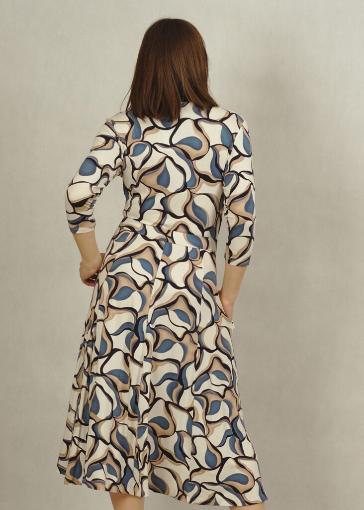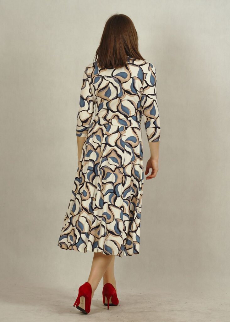 Sukienka ecru w subtelne niebieskie wzory to doskonały wybór dla miłośniczek eleganckich, a jednocześnie komfortowych stylizacji.