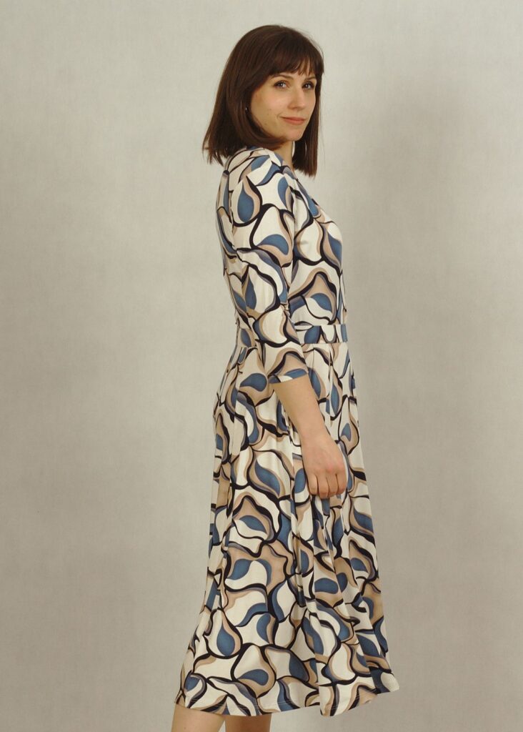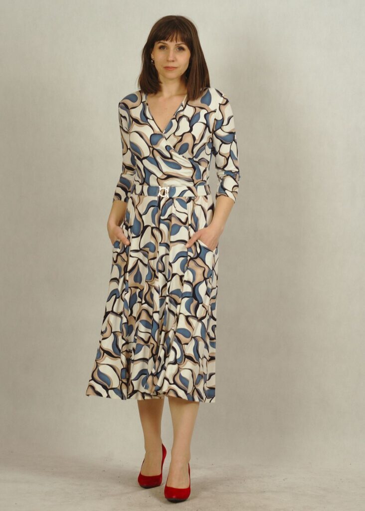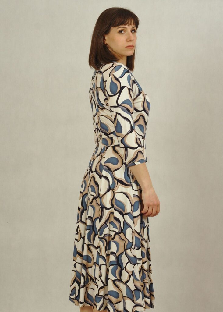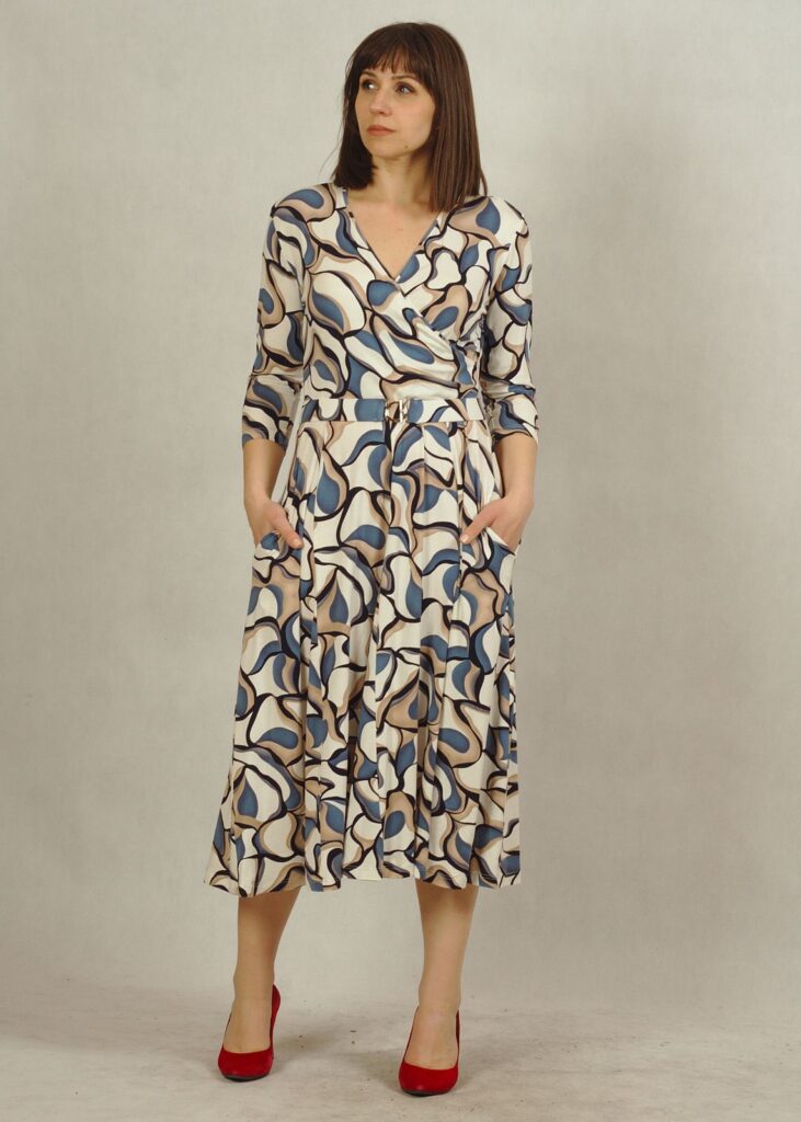Kopertowy dekolt subtelnie eksponuje biust i optycznie wysmukla figurę, a rękaw 3/4 sprawia, że sukienka elegancka sprawdzi się przez cały rok – zarówno na specjalne okazje, jak i na co dzień.